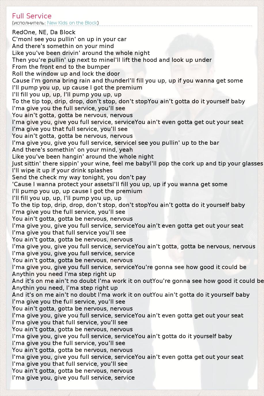 RedOne, NE, Da Block C'monI see you pullin' on up in your car And there's somethin on your mind Like you've been drivin' around the whole night Then you're pullin' up next to mineI'll lift the hood and look up under From the front end to the bumper Roll the window up and lock the door Cause I'm gonna bring rain and thunderI'll fill you up, up if you wanna get some I'll pump you up, up cause I got the premium I'll fill you up, up, I'll pump you up, up To the tip top, drip, drop, don't stop, don't stopYou ain't gotta do it yourself baby I'ma give you the full service, you'll see You ain't gotta, gotta be nervous, nervous I'ma give you, give you full service, serviceYou ain't even gotta get out your seat I'ma give you that full service, you'll see You ain't gotta, gotta be nervous, nervous I'ma give you, give you full service, serviceI see you pullin' up to the bar And there's somethin' on your mind, yeah Like you've been hangin' around the whole night Just sittin' there sippin' your wine, feel me babyI'll pop the cork up and tip your glasses I'll wipe it up if your drink splashes Send the check my way tonight, you don't pay 'Cause I wanna protect your assetsI'll fill you up, up if you wanna get some I'll pump you up, up cause I got the premium I'll fill you up, up, I'll pump you up, up To the tip top, drip, drop, don't stop, don't stopYou ain't gotta do it yourself baby I'ma give you the full service, you'll see You ain't gotta, gotta be nervous, nervous I'ma give you, give you full service, serviceYou ain't even gotta get out your seat I'ma give you that full service you'll see You ain't gotta, gotta be nervous, nervous I'ma give you, give you full service, serviceYou ain't gotta, gotta be nervous, nervous I'ma give you, give you full service, service You ain't gotta, gotta be nervous, nervous I'ma give you, give you full service, serviceYou're gonna see how good it could be Anythin you need I'ma step right up And it's on me ain't no doubt I'ma work it on outYou're gonna see how good it could be Anythin you need, I'ma step right up And it's on me ain't no doubt I'ma work it on outYou ain't gotta do it yourself baby I'ma give you the full service, you'll see You ain't gotta, gotta be nervous, nervous I'ma give you, give you full service, serviceYou ain't even gotta get out your seat I'ma give you that full service, you'll see You ain't gotta, gotta be nervous, nervous I'ma give you, give you full service, serviceYou ain't gotta do it yourself baby I'ma give you the full service, you'll see You ain't gotta, gotta be nervous, nervous I'ma give you, give you full service, serviceYou ain't even gotta get out your seat I'ma give you that full service, you'll see You ain't gotta, gotta be nervous, nervous I'ma give you, give you full service, service