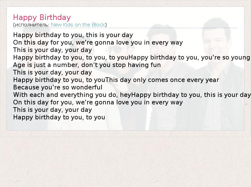 Happy birthday to you, this is your day On this day for you, we're gonna love you in every way This is your day, your day Happy birthday to you, to you, to youHappy birthday to you, you're so young Age is just a number, don't you stop having fun This is your day, your day Happy birthday to you, to youThis day only comes once every year Because you're so wonderful With each and everything you do, heyHappy birthday to you, this is your day On this day for you, we're gonna love you in every way This is your day, your day Happy birthday to you, to you