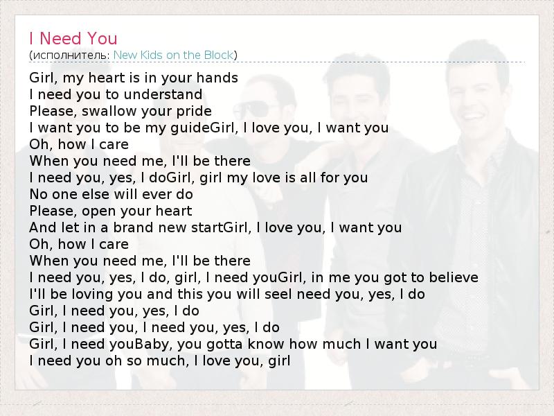 Girl, my heart is in your hands I need you to understand Please, swallow your pride I want you to be my guideGirl, I love you, I want you Oh, how I care When you need me, I'll be there I need you, yes, I doGirl, girl my love is all for you No one else will ever do Please, open your heart And let in a brand new startGirl, I love you, I want you Oh, how I care When you need me, I'll be there I need you, yes, I do, girl, I need youGirl, in me you got to believe I'll be loving you and this you will seeI need you, yes, I do Girl, I need you, yes, I do Girl, I need you, I need you, yes, I do Girl, I need youBaby, you gotta know how much I want you I need you oh so much, I love you, girl