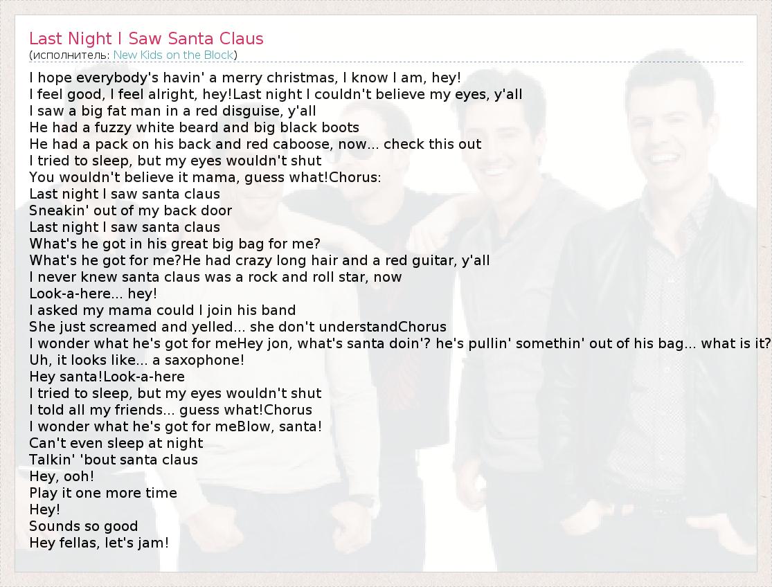 I hope everybody's havin' a merry christmas, I know I am, hey! I feel good, I feel alright, hey!Last night I couldn't believe my eyes, y'all I saw a big fat man in a red disguise, y'all He had a fuzzy white beard and big black boots He had a pack on his back and red caboose, now... check this out I tried to sleep, but my eyes wouldn't shut You wouldn't believe it mama, guess what!Chorus: Last night I saw santa claus Sneakin' out of my back door Last night I saw santa claus What's he got in his great big bag for me? What's he got for me?He had crazy long hair and a red guitar, y'all I never knew santa claus was a rock and roll star, now Look-a-here... hey! I asked my mama could I join his band She just screamed and yelled... she don't understandChorus I wonder what he's got for meHey jon, what's santa doin'? he's pullin' somethin' out of his bag... what is it? Uh, it looks like... a saxophone! Hey santa!Look-a-here I tried to sleep, but my eyes wouldn't shut I told all my friends... guess what!Chorus I wonder what he's got for meBlow, santa! Can't even sleep at night Talkin' 'bout santa claus Hey, ooh! Play it one more time Hey! Sounds so good Hey fellas, let's jam!