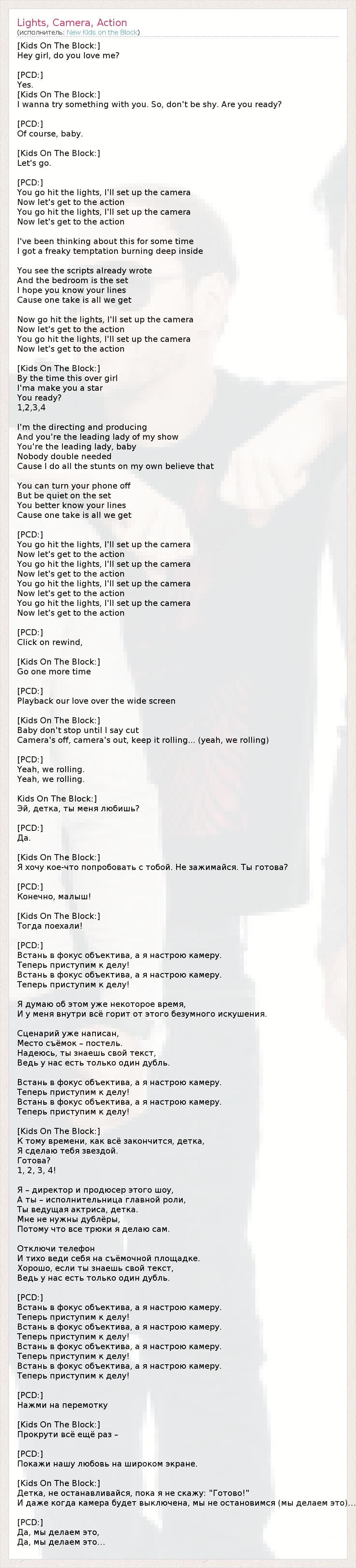 [Kids On The Block:] Hey girl, do you love me? [PCD:] Yes. [Kids On The Block:] I wanna try something with you. So, don't be shy. Are you ready? [PCD:] Of course, baby. [Kids On The Block:] Let's go. [PCD:] You go hit the lights, I'll set up the camera Now let's get to the action You go hit the lights, I'll set up the camera Now let's get to the action I've been thinking about this for some time I got a freaky temptation burning deep inside You see the scripts already wrote And the bedroom is the set I hope you know your lines Cause one take is all we get Now go hit the lights, I'll set up the camera Now let's get to the action You go hit the lights, I'll set up the camera Now let's get to the action [Kids On The Block:] By the time this over girl I'ma make you a star You ready? 1,2,3,4 I'm the directing and producing And you're the leading lady of my show You're the leading lady, baby Nobody double needed Cause I do all the stunts on my own believe that You can turn your phone off But be quiet on the set You better know your lines Cause one take is all we get [PCD:] You go hit the lights, I'll set up the camera Now let's get to the action You go hit the lights, I'll set up the camera Now let's get to the action You go hit the lights, I'll set up the camera Now let's get to the action You go hit the lights, I'll set up the camera Now let's get to the action [PCD:] Click on rewind, [Kids On The Block:] Go one more time [PCD:] Playback our love over the wide screen [Kids On The Block:] Baby don't stop until I say cut Camera's off, camera's out, keep it rolling... (yeah, we rolling) [PCD:] Yeah, we rolling. Yeah, we rolling. Kids On The Block:] Эй, детка, ты меня любишь? [PCD:] Да. [Kids On The Block:] Я хочу кое-что попробовать с тобой. Не зажимайся. Ты готова? [PCD:] Конечно, малыш! [Kids On The Block:] Тогда поехали! [PCD:] Встань в фокус объектива, а я настрою камеру. Теперь приступим к делу! Встань в фокус объектива, а я настрою камеру. Теперь приступим к делу! Я думаю об этом уже некоторое время, И у меня внутри всё горит от этого безумного искушения. Сценарий уже написан, Место съёмок – постель. Надеюсь, ты знаешь свой текст, Ведь у нас есть только один дубль. Встань в фокус объектива, а я настрою камеру. Теперь приступим к делу! Встань в фокус объектива, а я настрою камеру. Теперь приступим к делу! [Kids On The Block:] К тому времени, как всё закончится, детка, Я сделаю тебя звездой. Готова? 1, 2, 3, 4! Я – директор и продюсер этого шоу, А ты – исполнительница главной роли, Ты ведущая актриса, детка. Мне не нужны дублёры, Потому что все трюки я делаю сам. Отключи телефон И тихо веди себя на съёмочной площадке. Хорошо, если ты знаешь свой текст, Ведь у нас есть только один дубль. [PCD:] Встань в фокус объектива, а я настрою камеру. Теперь приступим к делу! Встань в фокус объектива, а я настрою камеру. Теперь приступим к делу! Встань в фокус объектива, а я настрою камеру. Теперь приступим к делу! Встань в фокус объектива, а я настрою камеру. Теперь приступим к делу! [PCD:] Нажми на перемотку [Kids On The Block:] Прокрути всё ещё раз – [PCD:] Покажи нашу любовь на широком экране. [Kids On The Block:] Детка, не останавливайся, пока я не скажу: "Готово!" И даже когда камера будет выключена, мы не остановимся (мы делаем это)… [PCD:] Да, мы делаем это, Да, мы делаем это…