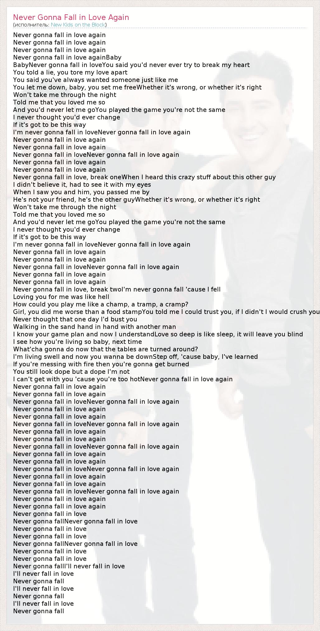 Never gonna fall in love again Never gonna fall in love again Never gonna fall in love again Never gonna fall in love againBaby BabyNever gonna fall in loveYou said you'd never ever try to break my heart You told a lie, you tore my love apart You said you've always wanted someone just like me You let me down, baby, you set me freeWhether it's wrong, or whether it's right Won't take me through the night Told me that you loved me so And you'd never let me goYou played the game you're not the same I never thought you'd ever change If it's got to be this way I'm never gonna fall in loveNever gonna fall in love again Never gonna fall in love again Never gonna fall in love again Never gonna fall in loveNever gonna fall in love again Never gonna fall in love again Never gonna fall in love again Never gonna fall in love, break oneWhen I heard this crazy stuff about this other guy I didn't believe it, had to see it with my eyes When I saw you and him, you passed me by He's not your friend, he's the other guyWhether it's wrong, or whether it's right Won't take me through the night Told me that you loved me so And you'd never let me goYou played the game you're not the same I never thought you'd ever change If it's got to be this way I'm never gonna fall in loveNever gonna fall in love again Never gonna fall in love again Never gonna fall in love again Never gonna fall in loveNever gonna fall in love again Never gonna fall in love again Never gonna fall in love again Never gonna fall in love, break twoI'm never gonna fall 'cause I fell Loving you for me was like hell How could you play me like a champ, a tramp, a cramp? Girl, you did me worse than a food stampYou told me I could trust you, if I didn't I would crush you Never thought that one day I'd bust you Walking in the sand hand in hand with another man I know your game plan and now I understandLove so deep is like sleep, it will leave you blind I see how you're living so baby, next time What'cha gonna do now that the tables are turned around? I'm living swell and now you wanna be downStep off, 'cause baby, I've learned If you're messing with fire then you're gonna get burned You still look dope but a dope I'm not I can't get with you 'cause you're too hotNever gonna fall in love again Never gonna fall in love again Never gonna fall in love again Never gonna fall in loveNever gonna fall in love again Never gonna fall in love again Never gonna fall in love again Never gonna fall in loveNever gonna fall in love again Never gonna fall in love again Never gonna fall in love again Never gonna fall in loveNever gonna fall in love again Never gonna fall in love again Never gonna fall in love again Never gonna fall in loveNever gonna fall in love again Never gonna fall in love again Never gonna fall in love again Never gonna fall in loveNever gonna fall in love again Never gonna fall in love again Never gonna fall in love again Never gonna fall in love Never gonna fallNever gonna fall in love Never gonna fall in love Never gonna fall in love Never gonna fallNever gonna fall in love Never gonna fall in love Never gonna fall in love Never gonna fallI'll never fall in love I'll never fall in love Never gonna fall I'll never fall in love Never gonna fall I'll never fall in love Never gonna fall