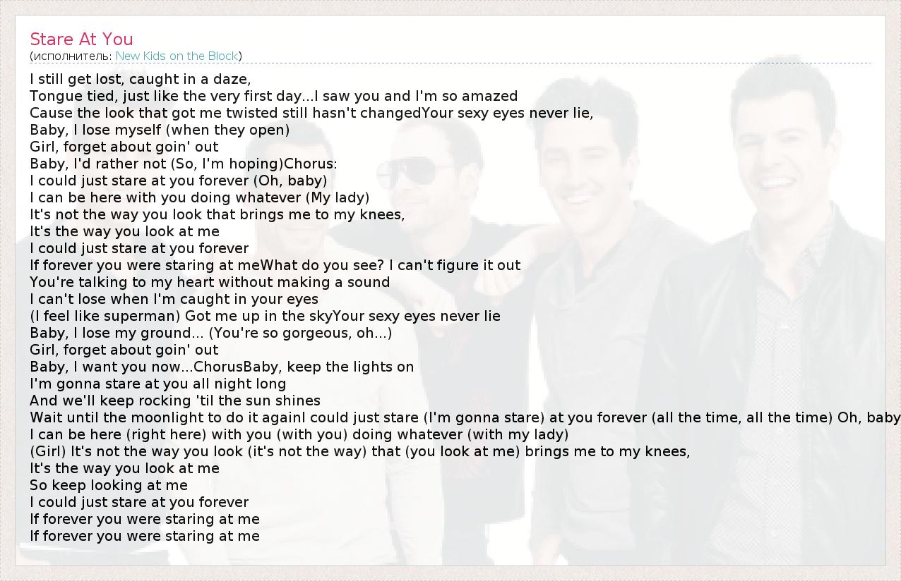 I still get lost, caught in a daze, Tongue tied, just like the very first day...I saw you and I'm so amazed Cause the look that got me twisted still hasn't changedYour sexy eyes never lie, Baby, I lose myself (when they open) Girl, forget about goin' out Baby, I'd rather not (So, I'm hoping)Chorus: I could just stare at you forever (Oh, baby) I can be here with you doing whatever (My lady) It's not the way you look that brings me to my knees, It's the way you look at me I could just stare at you forever If forever you were staring at meWhat do you see? I can't figure it out You're talking to my heart without making a sound I can't lose when I'm caught in your eyes (I feel like superman) Got me up in the skyYour sexy eyes never lie Baby, I lose my ground... (You're so gorgeous, oh...) Girl, forget about goin' out Baby, I want you now...ChorusBaby, keep the lights on I'm gonna stare at you all night long And we'll keep rocking 'til the sun shines Wait until the moonlight to do it againI could just stare (I'm gonna stare) at you forever (all the time, all the time) Oh, baby I can be here (right here) with you (with you) doing whatever (with my lady) (Girl) It's not the way you look (it's not the way) that (you look at me) brings me to my knees, It's the way you look at me So keep looking at me I could just stare at you forever If forever you were staring at me If forever you were staring at me