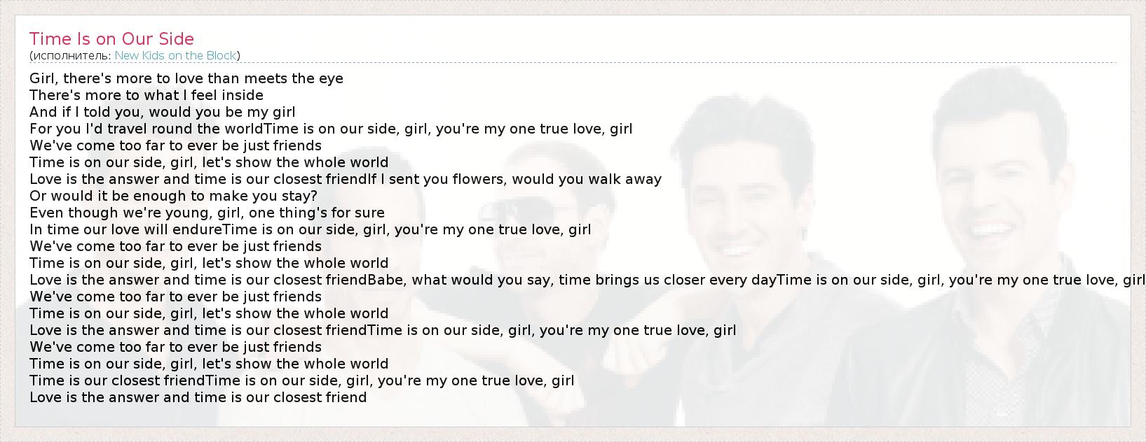 Girl, there's more to love than meets the eye There's more to what I feel inside And if I told you, would you be my girl For you I'd travel round the worldTime is on our side, girl, you're my one true love, girl We've come too far to ever be just friends Time is on our side, girl, let's show the whole world Love is the answer and time is our closest friendIf I sent you flowers, would you walk away Or would it be enough to make you stay? Even though we're young, girl, one thing's for sure In time our love will endureTime is on our side, girl, you're my one true love, girl We've come too far to ever be just friends Time is on our side, girl, let's show the whole world Love is the answer and time is our closest friendBabe, what would you say, time brings us closer every dayTime is on our side, girl, you're my one true love, girl We've come too far to ever be just friends Time is on our side, girl, let's show the whole world Love is the answer and time is our closest friendTime is on our side, girl, you're my one true love, girl We've come too far to ever be just friends Time is on our side, girl, let's show the whole world Time is our closest friendTime is on our side, girl, you're my one true love, girl Love is the answer and time is our closest friend