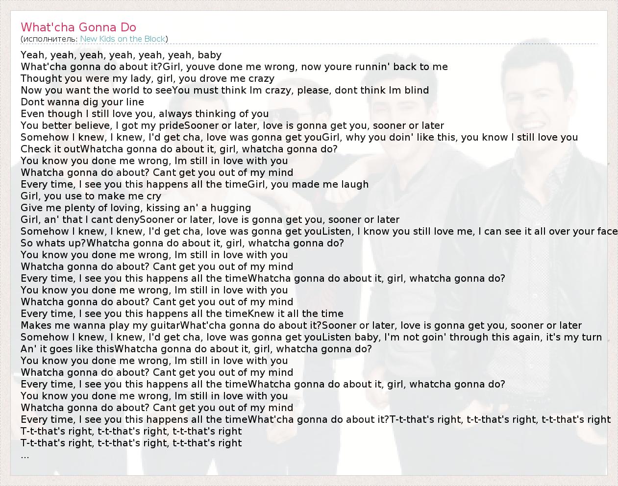 А как ты думаешь, о чем песня "What'cha Gonna Do" ?