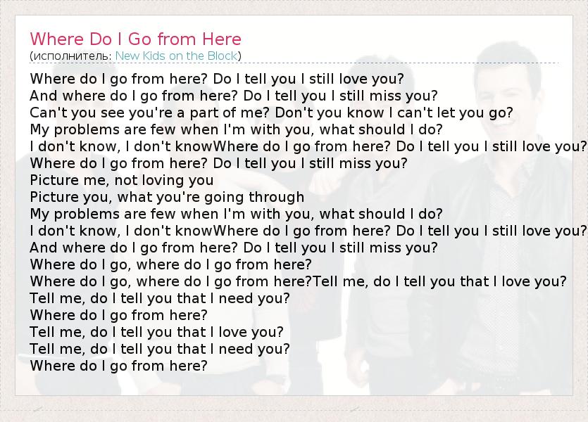 Where do I go from here? Do I tell you I still love you? And where do I go from here? Do I tell you I still miss you? Can't you see you're a part of me? Don't you know I can't let you go? My problems are few when I'm with you, what should I do? I don't know, I don't knowWhere do I go from here? Do I tell you I still love you? Where do I go from here? Do I tell you I still miss you? Picture me, not loving you Picture you, what you're going through My problems are few when I'm with you, what should I do? I don't know, I don't knowWhere do I go from here? Do I tell you I still love you? And where do I go from here? Do I tell you I still miss you? Where do I go, where do I go from here? Where do I go, where do I go from here?Tell me, do I tell you that I love you? Tell me, do I tell you that I need you? Where do I go from here? Tell me, do I tell you that I love you? Tell me, do I tell you that I need you? Where do I go from here?