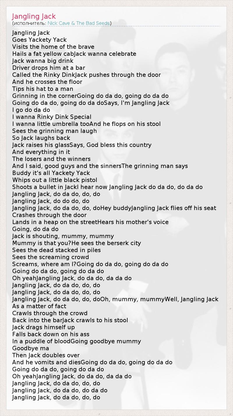 Jangling Jack Goes Yackety Yack Visits the home of the brave Hails a fat yellow cabJack wanna celebrate Jack wanna big drink Driver drops him at a bar Called the Rinky DinkJack pushes through the door And he crosses the floor Tips his hat to a man Grinning in the cornerGoing do da do, going do da do Going do da do, going do da doSays, I'm Jangling Jack I go do da do I wanna Rinky Dink Special I wanna little umbrella tooAnd he flops on his stool Sees the grinning man laugh So Jack laughs back Jack raises his glassSays, God bless this country And everything in it The losers and the winners And I said, good guys and the sinnersThe grinning man says Buddy it's all Yackety Yack Whips out a little black pistol Shoots a bullet in JackI hear now Jangling Jack do da do, do da do Jangling Jack, do da do, do, do Jangling Jack, do do do, do Jangling Jack, do da do, do, doHey buddyJangling Jack flies off his seat Crashes through the door Lands in a heap on the streetHears his mother's voice Going, do da do Jack is shouting, mummy, mummy Mummy is that you?He sees the berserk city Sees the dead stacked in piles Sees the screaming crowd Screams, where am I?Going do da do, going do da do Going do da do, going do da do Oh yeahJangling Jack, do da do, da da do Jangling Jack, do da do, do, do Jangling Jack, do da do, do, do Jangling Jack, do da do, do, doOh, mummy, mummyWell, Jangling Jack As a matter of fact Crawls through the crowd Back into the barJack crawls to his stool Jack drags himself up Falls back down on his ass In a puddle of bloodGoing goodbye mummy Goodbye ma Then Jack doubles over And he vomits and diesGoing do da do, going do da do Going do da do, going do da do Oh yeahJangling Jack, do da do, da da do Jangling Jack, do da do, do, do Jangling Jack, do da do, do da do Jangling Jack, do da do, do, do