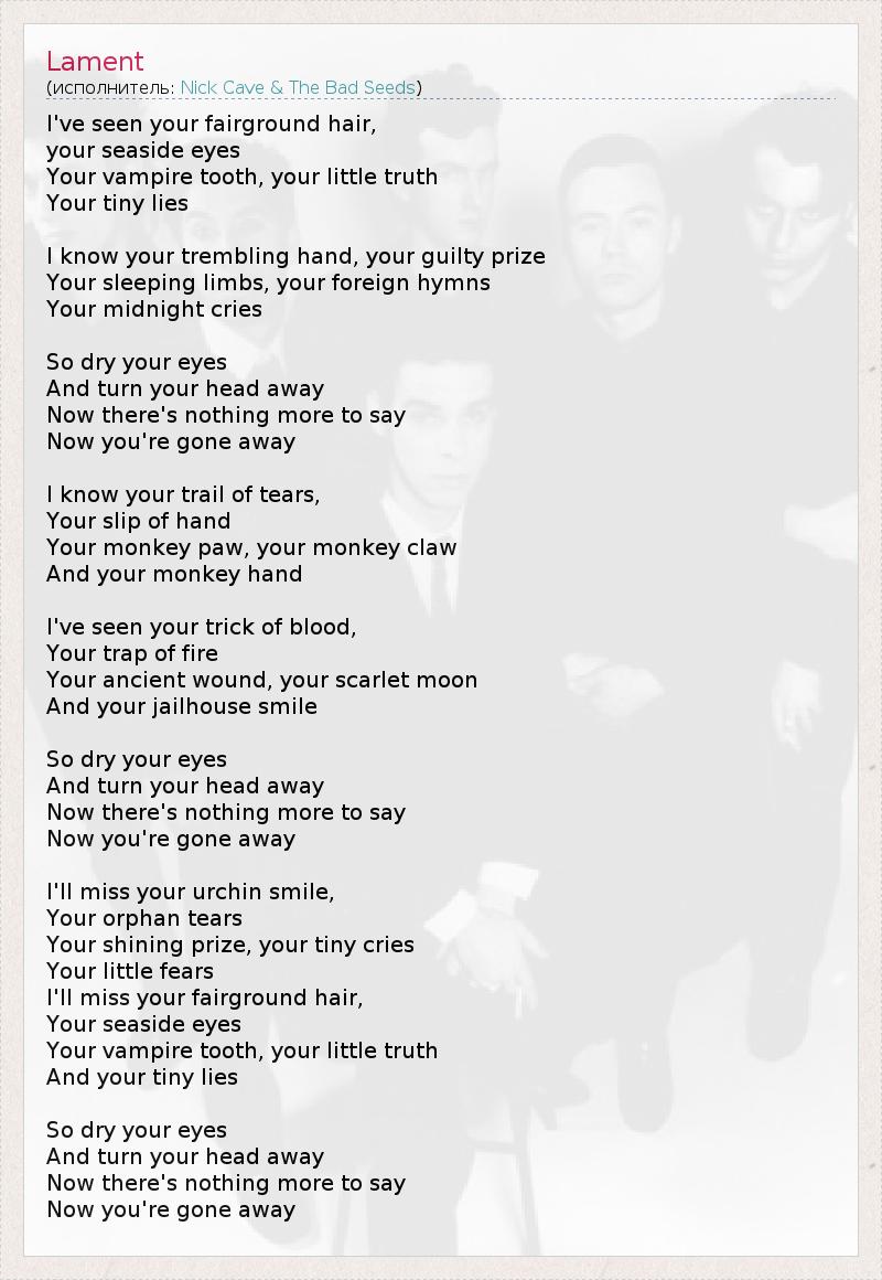 I've seen your fairground hair, your seaside eyes Your vampire tooth, your little truth Your tiny lies I know your trembling hand, your guilty prize Your sleeping limbs, your foreign hymns Your midnight cries So dry your eyes And turn your head away Now there's nothing more to say Now you're gone away I know your trail of tears, Your slip of hand Your monkey paw, your monkey claw And your monkey hand I've seen your trick of blood, Your trap of fire Your ancient wound, your scarlet moon And your jailhouse smile So dry your eyes And turn your head away Now there's nothing more to say Now you're gone away I'll miss your urchin smile, Your orphan tears Your shining prize, your tiny cries Your little fears I'll miss your fairground hair, Your seaside eyes Your vampire tooth, your little truth And your tiny lies So dry your eyes And turn your head away Now there's nothing more to say Now you're gone away