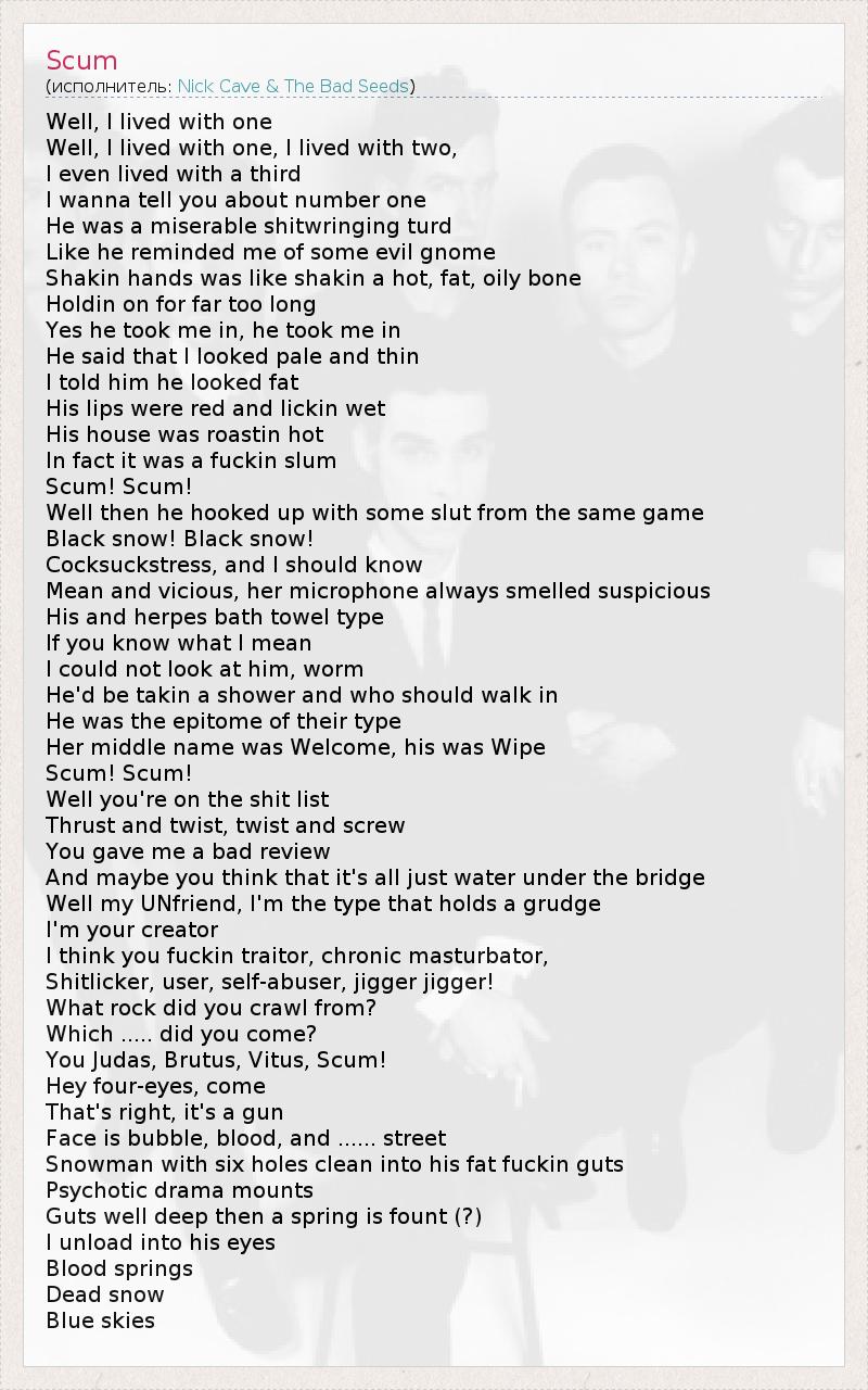 Well, I lived with one Well, I lived with one, I lived with two, I even lived with a third I wanna tell you about number one He was a miserable shitwringing turd Like he reminded me of some evil gnome Shakin hands was like shakin a hot, fat, oily bone Holdin on for far too long Yes he took me in, he took me in He said that I looked pale and thin I told him he looked fat His lips were red and lickin wet His house was roastin hot In fact it was a fuckin slum Scum! Scum! Well then he hooked up with some slut from the same game Black snow! Black snow! Cocksuckstress, and I should know Mean and vicious, her microphone always smelled suspicious His and herpes bath towel type If you know what I mean I could not look at him, worm He'd be takin a shower and who should walk in He was the epitome of their type Her middle name was Welcome, his was Wipe Scum! Scum! Well you're on the shit list Thrust and twist, twist and screw You gave me a bad review And maybe you think that it's all just water under the bridge Well my UNfriend, I'm the type that holds a grudge I'm your creator I think you fuckin traitor, chronic masturbator, Shitlicker, user, self-abuser, jigger jigger! What rock did you crawl from? Which ..... did you come? You Judas, Brutus, Vitus, Scum! Hey four-eyes, come That's right, it's a gun Face is bubble, blood, and ...... street Snowman with six holes clean into his fat fuckin guts Psychotic drama mounts Guts well deep then a spring is fount (?) I unload into his eyes Blood springs Dead snow Blue skies