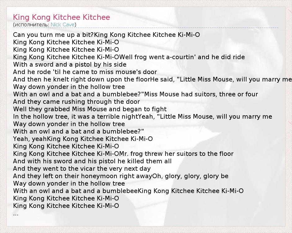 Can you turn me up a bit?King Kong Kitchee Kitchee Ki-Mi-O King Kong Kitchee Kitchee Ki-Mi-O King Kong Kitchee Kitchee Ki-Mi-O King Kong Kitchee Kitchee Ki-Mi-OWell frog went a-courtin' and he did ride With a sword and a pistol by his side And he rode 'til he came to miss mouse's door And then he knelt right down upon the floorHe said, "Little Miss Mouse, will you marry me Way down yonder in the hollow tree With an owl and a bat and a bumblebee?"Miss Mouse had suitors, three or four And they came rushing through the door Well they grabbed Miss Mouse and began to fight In the hollow tree, it was a terrible nightYeah, "Little Miss Mouse, will you marry me Way down yonder in the hollow tree With an owl and a bat and a bumblebee?" Yeah, yeahKing Kong Kitchee Kitchee Ki-Mi-O King Kong Kitchee Kitchee Ki-Mi-O King Kong Kitchee Kitchee Ki-Mi-OMr. frog threw her suitors to the floor And with his sword and his pistol he killed them all And they went to the vicar the very next day And they left on their honeymoon right awayOh, glory, glory, glory be Way down yonder in the hollow tree With an owl and a bat and a bumblebeeKing Kong Kitchee Kitchee Ki-Mi-O King Kong Kitchee Kitchee Ki-Mi-O King Kong Kitchee Kitchee Ki-Mi-O ...