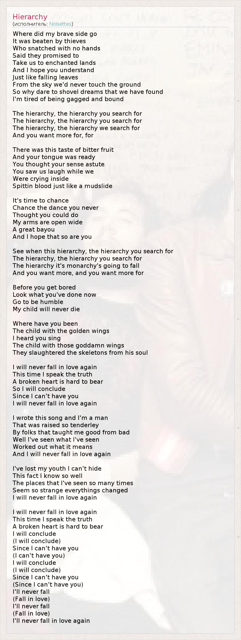 Where did my brave side go It was beaten by thieves Who snatched with no hands Said they promised to Take us to enchanted lands And I hope you understand Just like falling leaves From the sky we'd never touch the ground So why dare to shovel dreams that we have found I'm tired of being gagged and bound The hierarchy, the hierarchy you search for The hierarchy, the hierarchy you search for The hierarchy, the hierarchy we search for And you want more for, for There was this taste of bitter fruit And your tongue was ready You thought your sense astute You saw us laugh while we Were crying inside Spittin blood just like a mudslide It's time to chance Chance the dance you never Thought you could do My arms are open wide A great bayou And I hope that so are you See when this hierarchy, the hierarchy you search for The hierarchy, the hierarchy you search for The hierarchy it's monarchy's going to fall And you want more, and you want more for Before you get bored Look what you've done now Go to be humble My child will never die Where have you been The child with the golden wings I heard you sing The child with those goddamn wings They slaughtered the skeletons from his soul I will never fall in love again This time I speak the truth A broken heart is hard to bear So I will conclude Since I can't have you I will never fall in love again I wrote this song and I'm a man That was raised so tenderley By folks that taught me good from bad Well I've seen what I've seen Worked out what it means And I will never fall in love again I've lost my youth I can't hide This fact I know so well The places that I've seen so many times Seem so strange everythings changed I will never fall in love again I will never fall in love again This time I speak the truth A broken heart is hard to bear I will conclude (I will conclude) Since I can't have you (I can't have you) I will conclude (I will conclude) Since I can't have you (Since I can't have you) I'll never fall (Fall in love) I'll never fall (Fall in love) I'll never fall in love again