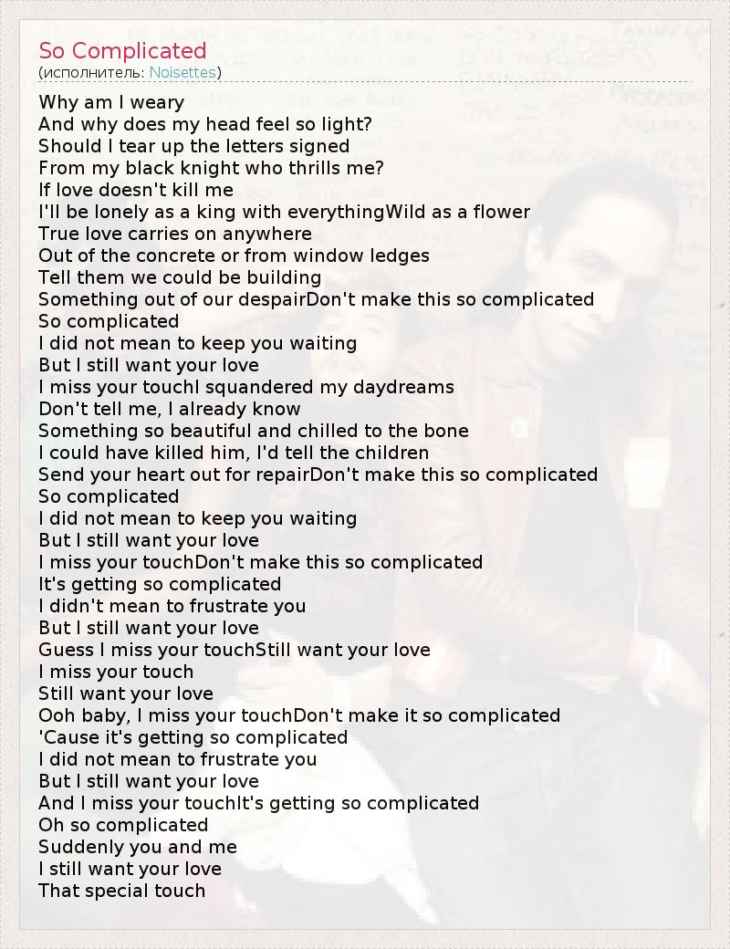 Why am I weary And why does my head feel so light? Should I tear up the letters signed From my black knight who thrills me? If love doesn't kill me I'll be lonely as a king with everythingWild as a flower True love carries on anywhere Out of the concrete or from window ledges Tell them we could be building Something out of our despairDon't make this so complicated So complicated I did not mean to keep you waiting But I still want your love I miss your touchI squandered my daydreams Don't tell me, I already know Something so beautiful and chilled to the bone I could have killed him, I'd tell the children Send your heart out for repairDon't make this so complicated So complicated I did not mean to keep you waiting But I still want your love I miss your touchDon't make this so complicated It's getting so complicated I didn't mean to frustrate you But I still want your love Guess I miss your touchStill want your love I miss your touch Still want your love Ooh baby, I miss your touchDon't make it so complicated 'Cause it's getting so complicated I did not mean to frustrate you But I still want your love And I miss your touchIt's getting so complicated Oh so complicated Suddenly you and me I still want your love That special touch