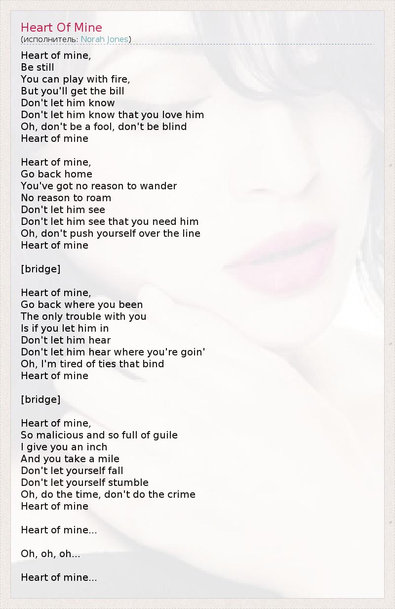 Heart of mine, Be still You can play with fire, But you'll get the bill Don't let him know Don't let him know that you love him Oh, don't be a fool, don't be blind Heart of mine Heart of mine, Go back home You've got no reason to wander No reason to roam Don't let him see Don't let him see that you need him Oh, don't push yourself over the line Heart of mine [bridge] Heart of mine, Go back where you been The only trouble with you Is if you let him in Don't let him hear Don't let him hear where you're goin' Oh, I'm tired of ties that bind Heart of mine [bridge] Heart of mine, So malicious and so full of guile I give you an inch And you take a mile Don't let yourself fall Don't let yourself stumble Oh, do the time, don't do the crime Heart of mine Heart of mine... Oh, oh, oh... Heart of mine...