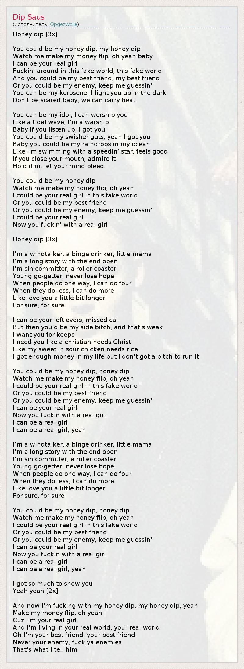 Honey dip [3x] You could be my honey dip, my honey dip Watch me make my money flip, oh yeah baby I can be your real girl Fuckin' around in this fake world, this fake world And you could be my best friend, my best friend Or you could be my enemy, keep me guessin' You can be my kerosene, I light you up in the dark Don't be scared baby, we can carry heat You can be my idol, I can worship you Like a tidal wave, I'm a warship Baby if you listen up, I got you You could be my swisher guts, yeah I got you Baby you could be my raindrops in my ocean Like I'm swimming with a speedin' star, feels good If you close your mouth, admire it Hold it in, let your mind bleed You could be my honey dip Watch me make my honey flip, oh yeah I could be your real girl in this fake world Or you could be my best friend Or you could be my enemy, keep me guessin' I could be your real girl Now you fuckin' with a real girl Honey dip [3x] I'm a windtalker, a binge drinker, little mama I'm a long story with the end open I'm sin committer, a roller coaster Young go-getter, never lose hope When people do one way, I can do four When they do less, I can do more Like love you a little bit longer For sure, for sure I can be your left overs, missed call But then you'd be my side bitch, and that's weak I want you for keeps I need you like a christian needs Christ Like my sweet 'n sour chicken needs rice I got enough money in my life but I don't got a bitch to run it You could be my honey dip, honey dip Watch me make my honey flip, oh yeah I could be your real girl in this fake world Or you could be my best friend Or you could be my enemy, keep me guessin' I can be your real girl Now you fuckin with a real girl I can be a real girl I can be a real girl, yeah I'm a windtalker, a binge drinker, little mama I'm a long story with the end open I'm sin committer, a roller coaster Young go-getter, never lose hope When people do one way, I can do four When they do less, I can do more Like love you a little bit longer For sure, for sure You could be my honey dip, honey dip Watch me make my honey flip, oh yeah I could be your real girl in this fake world Or you could be my best friend Or you could be my enemy, keep me guessin' I can be your real girl Now you fuckin with a real girl I can be a real girl I can be a real girl, yeah I got so much to show you Yeah yeah [2x] And now I'm fucking with my honey dip, my honey dip, yeah Make my money flip, oh yeah Cuz I'm your real girl And I'm living in your real world, your real world Oh I'm your best friend, your best friend Never your enemy, fuck ya enemies That's what I tell him