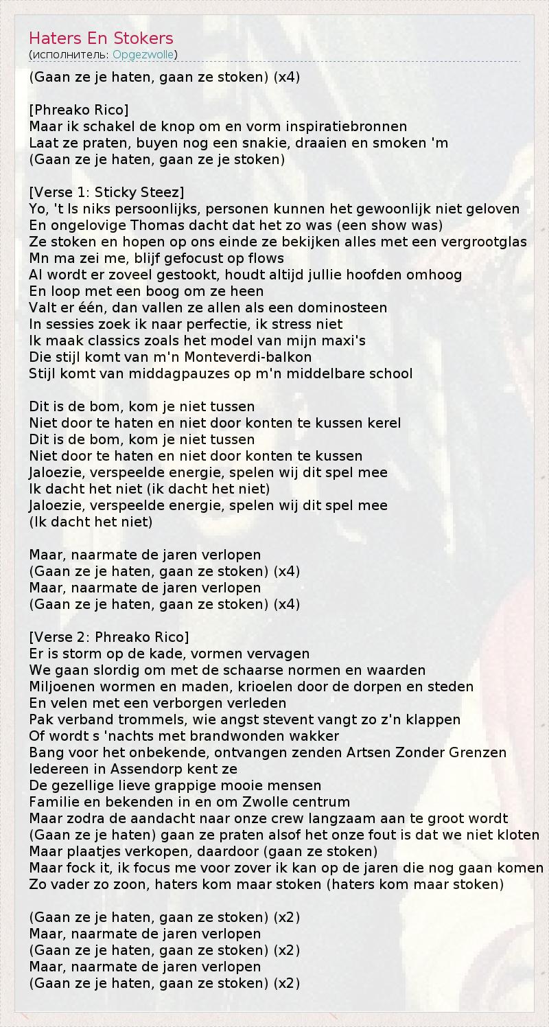 (Gaan ze je haten, gaan ze stoken) (x4) [Phreako Rico] Maar ik schakel de knop om en vorm inspiratiebronnen Laat ze praten, buyen nog een snakie, draaien en smoken 'm (Gaan ze je haten, gaan ze je stoken) [Verse 1: Sticky Steez] Yo, 't Is niks persoonlijks, personen kunnen het gewoonlijk niet geloven En ongelovige Thomas dacht dat het zo was (een show was) Ze stoken en hopen op ons einde ze bekijken alles met een vergrootglas Mn ma zei me, blijf gefocust op flows Al wordt er zoveel gestookt, houdt altijd jullie hoofden omhoog En loop met een boog om ze heen Valt er één, dan vallen ze allen als een dominosteen In sessies zoek ik naar perfectie, ik stress niet Ik maak classics zoals het model van mijn maxi's Die stijl komt van m'n Monteverdi-balkon Stijl komt van middagpauzes op m'n middelbare school Dit is de bom, kom je niet tussen Niet door te haten en niet door konten te kussen kerel Dit is de bom, kom je niet tussen Niet door te haten en niet door konten te kussen Jaloezie, verspeelde energie, spelen wij dit spel mee Ik dacht het niet (ik dacht het niet) Jaloezie, verspeelde energie, spelen wij dit spel mee (Ik dacht het niet) Maar, naarmate de jaren verlopen (Gaan ze je haten, gaan ze stoken) (x4) Maar, naarmate de jaren verlopen (Gaan ze je haten, gaan ze stoken) (x4) [Verse 2: Phreako Rico] Er is storm op de kade, vormen vervagen We gaan slordig om met de schaarse normen en waarden Miljoenen wormen en maden, krioelen door de dorpen en steden En velen met een verborgen verleden Pak verband trommels, wie angst stevent vangt zo z'n klappen Of wordt s 'nachts met brandwonden wakker Bang voor het onbekende, ontvangen zenden Artsen Zonder Grenzen Iedereen in Assendorp kent ze De gezellige lieve grappige mooie mensen Familie en bekenden in en om Zwolle centrum Maar zodra de aandacht naar onze crew langzaam aan te groot wordt (Gaan ze je haten) gaan ze praten alsof het onze fout is dat we niet kloten Maar plaatjes verkopen, daardoor (gaan ze stoken) Maar fock it, ik focus me voor zover ik kan op de jaren die nog gaan komen Zo vader zo zoon, haters kom maar stoken (haters kom maar stoken) (Gaan ze je haten, gaan ze stoken) (x2) Maar, naarmate de jaren verlopen (Gaan ze je haten, gaan ze stoken) (x2) Maar, naarmate de jaren verlopen (Gaan ze je haten, gaan ze stoken) (x2)
