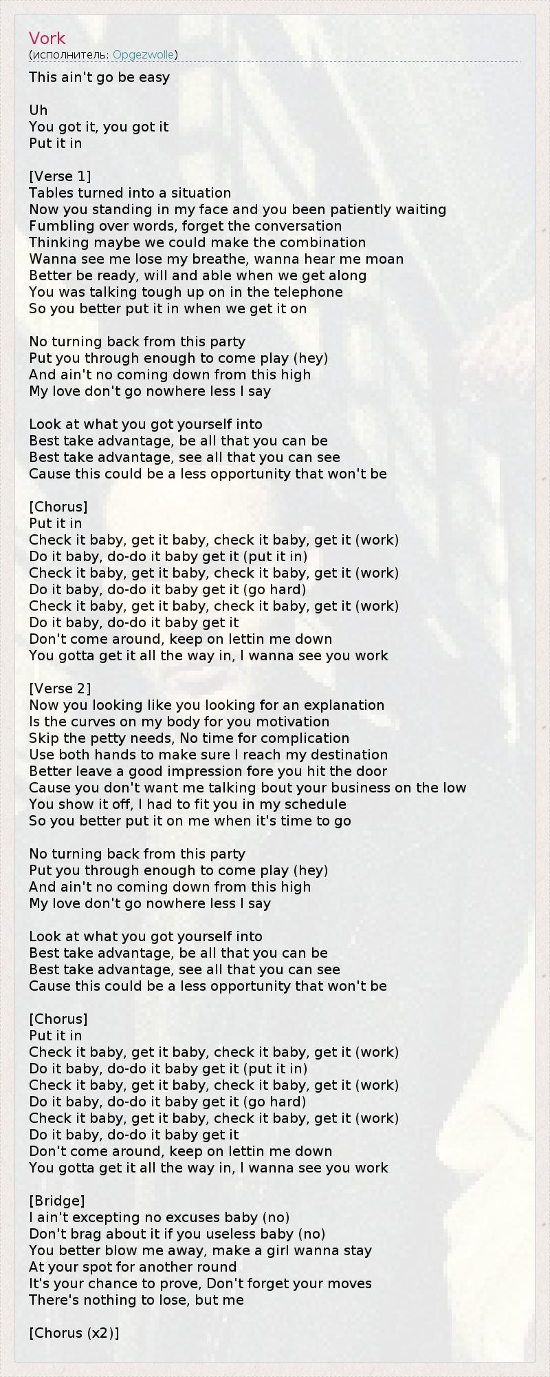 Это будет непросто… Да, Ты можешь это, можешь, Вперёд! [1-ый куплет:] Мы поменялись ролями, и вот наша ситуёвина: Теперь ты стоишь передо мной И терпеливо ждёшь, Мямля что-то невнятное. Хватит разговоров, Может, лучше займёмся более приятными вещами? Хочешь увидеть, как я задыхаюсь от страсти, хочешь услышать мои стоны? Будь во всеоружии, когда мы возьмёмся за дело. По телефону ты был гораздо бодрее! Поэтому делай, что следует, когда мы займёмся сексом. Тебе не уйти с этой вечеринки просто так. Я достаточно тебя испытывала, пришло время приступить к активным действиям. Мы зашли слишком далеко – нет пути назад. Любовь моя, никуда не уходи, пока я не скажу об этом! Посмотри, как тебе повезло! Воспользуйся ситуацией, покажи всё, на что способен! Воспользуйся ситуацией, возьми всё, что сможешь взять, Потому что лучшей возможности может и не представиться! [Припев:] Вставь его, Давай, малыш, понял? Давай, малыш, работай! Делай это, малыш, делай, понял? (Вставь его) Давай, малыш, понял? Давай, малыш, работай! Делай это, малыш, делай, понял? (Возбудись) Давай, малыш, понял? Давай, малыш, работай! Делай это, малыш, делай, понял? Не подходи ко мне, если собираешься вновь подвести меня. Ты должен доставить нам обоим полное удовлетворение, Я хочу увидеть, как ты работаешь! [2-ой куплет:] У тебя такое лицо, словно ты ищешь объяснение чему-то. Разве изгибы моего тела для тебя не достаточная мотивация? Забудь о проблемах, у нас просто нет на это времени. Используй обе руки, чтобы я, уж наверняка, достигла места назначения. Постарайся оставить приятное впечатление, прежде чем уйти, Ты ведь не хочешь, чтобы я Распустила сплетни о твоей неумелости в постели? Ты ведь не пускаешь пыль в глаза? Я с трудом выделила для тебя свободное время, Поэтому постарайся изо всех сил, когда дело дойдёт до этого. Тебе не уйти с этой вечеринки просто так. Я достаточно тебя испытывала, пришло время приступить к активным действиям. Мы зашли слишком далеко – нет пути назад. Любовь моя, никуда не уходи, пока я не скажу об этом! Посмотри, как тебе повезло! Воспользуйся ситуацией, покажи всё, на что способен! Воспользуйся ситуацией, возьми всё, что сможешь взять, Потому что лучшей возможности может и не представиться! [Припев:] Вставь его, Давай, малыш, понял? Давай, малыш, работай! Делай это, малыш, делай, понял? (Вставь его) Давай, малыш, понял? Давай, малыш, работай! Делай это, малыш, делай, понял? (Возбудись) Давай, малыш, понял? Давай, малыш, работай! Делай это, малыш, делай, понял? Не подходи ко мне, если собираешься вновь подвести меня. Ты должен доставить нам обоим полное удовлетворение, Я хочу увидеть, как ты работаешь! [Переход:] Никакие отговорки не принимаются, малыш (нет), Тогда не хвались об этом, если ты ни на что не способен. Лучше удиви меня, сделай так, чтобы девушка захотела остаться У тебя на новый раунд. Это твой шанс доказать свои способности, не забывай, что нужно делать. Тебе нечего терять, кроме меня… [Припев: 2 раза] Вставь его, Давай, малыш, понял? Давай, малыш, работай! Делай это, малыш, делай, понял? (Вставь его) Давай, малыш, понял? Давай, малыш, работай! Делай это, малыш, делай, понял? (Возбудись) Давай, малыш, понял? Давай, малыш, работай! Делай это, малыш, делай, понял? Не подходи ко мне, если собираешься вновь подвести меня. Ты должен доставить нам обоим полное удовлетворение, Я хочу увидеть, как ты работаешь!