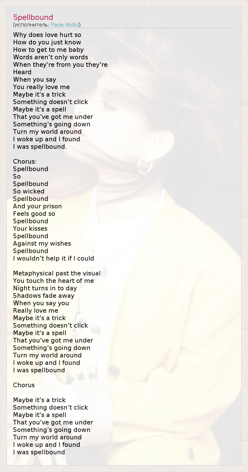 Why does love hurt so How do you just know How to get to me baby Words aren't only words When they're from you they're Heard When you say You really love me Maybe it's a trick Something doesn't click Maybe it's a spell That you've got me under Something's going down Turn my world around I woke up and I found I was spellbound. Chorus: Spellbound So Spellbound So wicked Spellbound And your prison Feels good so Spellbound Your kisses Spellbound Against my wishes Spellbound I wouldn't help it if I could Metaphysical past the visual You touch the heart of me Night turns in to day Shadows fade away When you say you Really love me Maybe it's a trick Something doesn't click Maybe it's a spell That you've got me under Something's going down Turn my world around I woke up and I found I was spellbound Chorus Maybe it's a trick Something doesn't click Maybe it's a spell That you've got me under Something's going down Turn my world around I woke up and I found I was spellbound