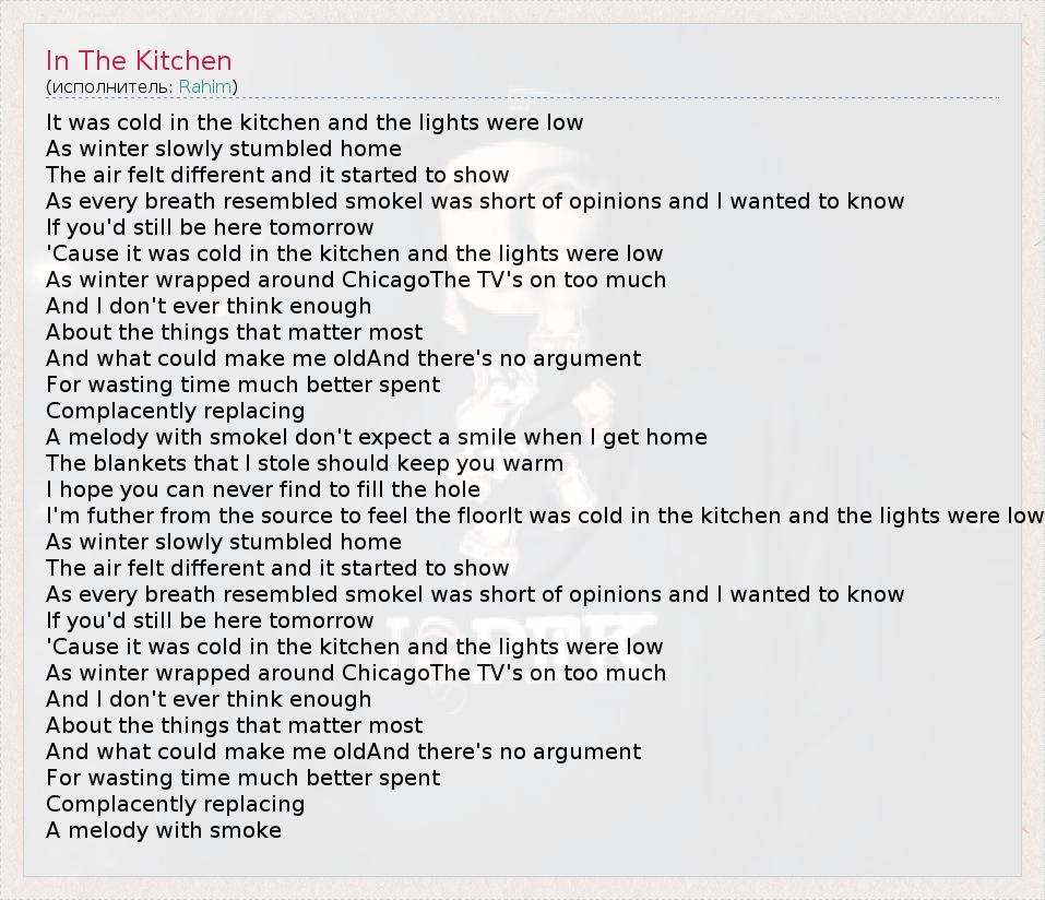 It was cold in the kitchen and the lights were low As winter slowly stumbled home The air felt different and it started to show As every breath resembled smokeI was short of opinions and I wanted to know If you'd still be here tomorrow 'Cause it was cold in the kitchen and the lights were low As winter wrapped around ChicagoThe TV's on too much And I don't ever think enough About the things that matter most And what could make me oldAnd there's no argument For wasting time much better spent Complacently replacing A melody with smokeI don't expect a smile when I get home The blankets that I stole should keep you warm I hope you can never find to fill the hole I'm futher from the source to feel the floorIt was cold in the kitchen and the lights were low As winter slowly stumbled home The air felt different and it started to show As every breath resembled smokeI was short of opinions and I wanted to know If you'd still be here tomorrow 'Cause it was cold in the kitchen and the lights were low As winter wrapped around ChicagoThe TV's on too much And I don't ever think enough About the things that matter most And what could make me oldAnd there's no argument For wasting time much better spent Complacently replacing A melody with smoke