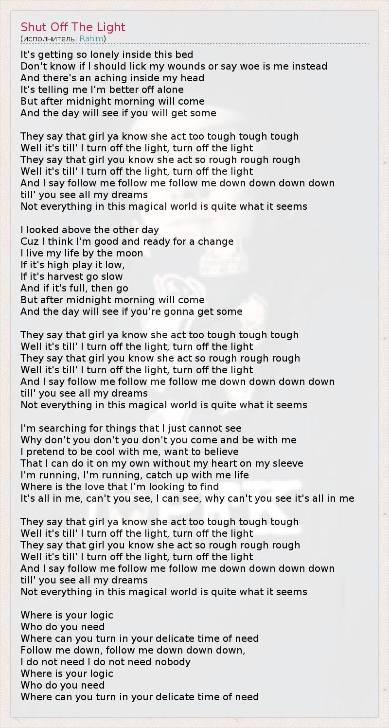 Становится одиноко в этой постели, Не знаю, зализывать ли мне раны или признать себя неудачницей... Эта боль в моей голове Говорит о том, что лучше быть одной. Но ведь после полуночи наступит рассвет, А новый день покажет, появится ли кто-нибудь рядом с тобой... О твоей девушке говорят, что она слишком жёсткая! Но это только пока ты не погасил свет! О твоей девушке говорят, что она слишком грубая! Но это до тех пор пока ты не погасил свет! И я говорю: иди ко мне, иди ко мне ниже, ниже.. ниже... И здесь ты увидишь все мои мечты. Ведь всё в этом волшебном мире совсем не такое, каким кажется.... На днях я заглянула в будущее, Думаю, я вполне готова к переменам. Я всегда жила по лунному календарю: Во время приливов - не высовывалась, В период прибывающей луны - не торопилась, А в полнолуние - уверенно действовала... Но после полуночи наступит рассвет, Новый день покажет, наступят ли перемены... О твоей девушке говорят, что она слишком жёсткая! Но это только пока ты не погасил свет! О твоей девушке говорят, что она слишком грубая! Но это до тех пор пока ты не погасил свет! И я говорю: иди ко мне, иди ко мне ниже, ниже... ниже... И здесь ты увидишь все мои мечты. Ведь всё в этом волшебном мире совсем не такое, каким кажется.... Я ищу то, что не в состоянии увидеть... Почему бы нам просто не быть вместе... Я разыгрываю хладнокровие... Хочется верить, Что я справлюсь одна, никому не открывая своего сердца.... Я бегу, бегу, пытаясь нагнать упущенную жизнь... Где та любовь, которую я пытаюсь найти? Она во мне, разве ты не видишь, она во мне!!! О твоей девушке говорят, что она слишком жёсткая! Но это только пока ты не погасил свет! О твоей девушке говорят, что она слишком грубая! Но это до тех пор пока ты не погасил свет! И я говорю: иди ко мне, иди ко мне ниже, ниже.. ниже... И здесь ты увидишь все мои мечты. Ведь всё в этом волшебном мире совсем не такое, каким кажется.... Где твоя логика? Кто тебе нужен? К кому ты обратишься в нелёгкие времена нужды? Иди за мной, ниже, ниже... Мне не нужен, мне никто не нужен... Где твоя логика? Кто тебе нужен? К кому ты обратишься в нелёгкие времена нужды?