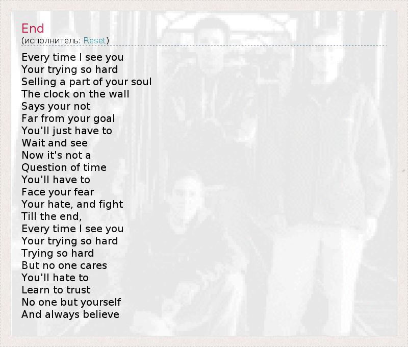 Every time I see you Your trying so hard Selling a part of your soul The clock on the wall Says your not Far from your goal You'll just have to Wait and see Now it's not a Question of time You'll have to Face your fear Your hate, and fight Till the end, Every time I see you Your trying so hard Trying so hard But no one cares You'll hate to Learn to trust No one but yourself And always believe
