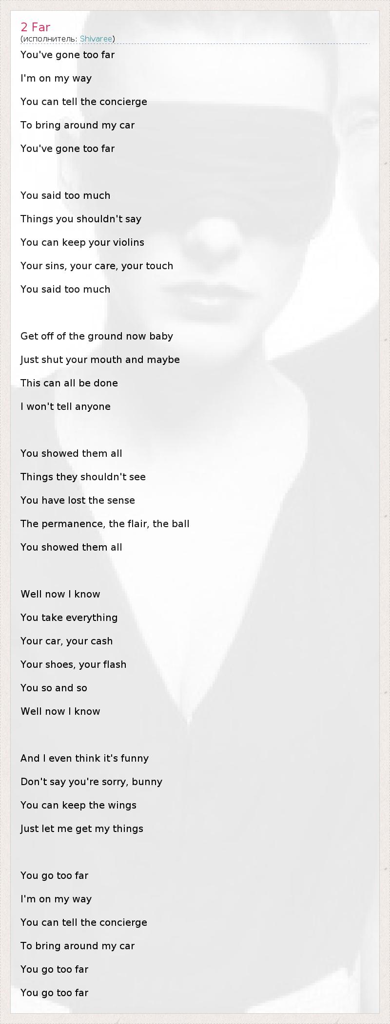 You've gone too far I'm on my way You can tell the concierge To bring around my car You've gone too far You said too much Things you shouldn't say You can keep your violins Your sins, your care, your touch You said too much Get off of the ground now baby Just shut your mouth and maybe This can all be done I won't tell anyone You showed them all Things they shouldn't see You have lost the sense The permanence, the flair, the ball You showed them all Well now I know You take everything Your car, your cash Your shoes, your flash You so and so Well now I know And I even think it's funny Don't say you're sorry, bunny You can keep the wings Just let me get my things You go too far I'm on my way You can tell the concierge To bring around my car You go too far You go too far