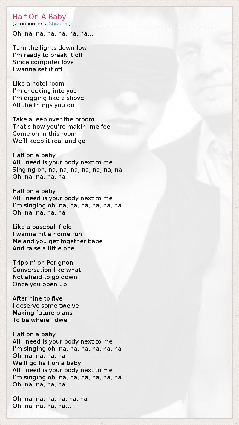 Oh, na, na, na, na, na, na… Turn the lights down low I'm ready to break it off Since computer love I wanna set it off Like a hotel room I'm checking into you I'm digging like a shovel All the things you do Take a leep over the broom That's how you're makin' me feel Come on in this room We’ll keep it real and go Half on a baby All I need is your body next to me Singing oh, na, na, na, na, na, na, na Oh, na, na, na, na Half on a baby All I need is your body next to me I'm singing oh, na, na, na, na, na, na Oh, na, na, na, na Like a baseball field I wanna hit a home run Me and you get together babe And raise a little one Trippin' on Perignon Conversation like what Not afraid to go down Once you open up After nine to five I deserve some twelve Making future plans To be where I dwell Half on a baby All I need is your body next to me I'm singing oh, na, na, na, na, na, na Oh, na, na, na, na We’ll go half on a baby All I need is your body next to me I'm singing oh, na, na, na, na, na, na Oh, na, na, na, na Oh, na, na, na, na, na, na Oh, na, na, na, na…