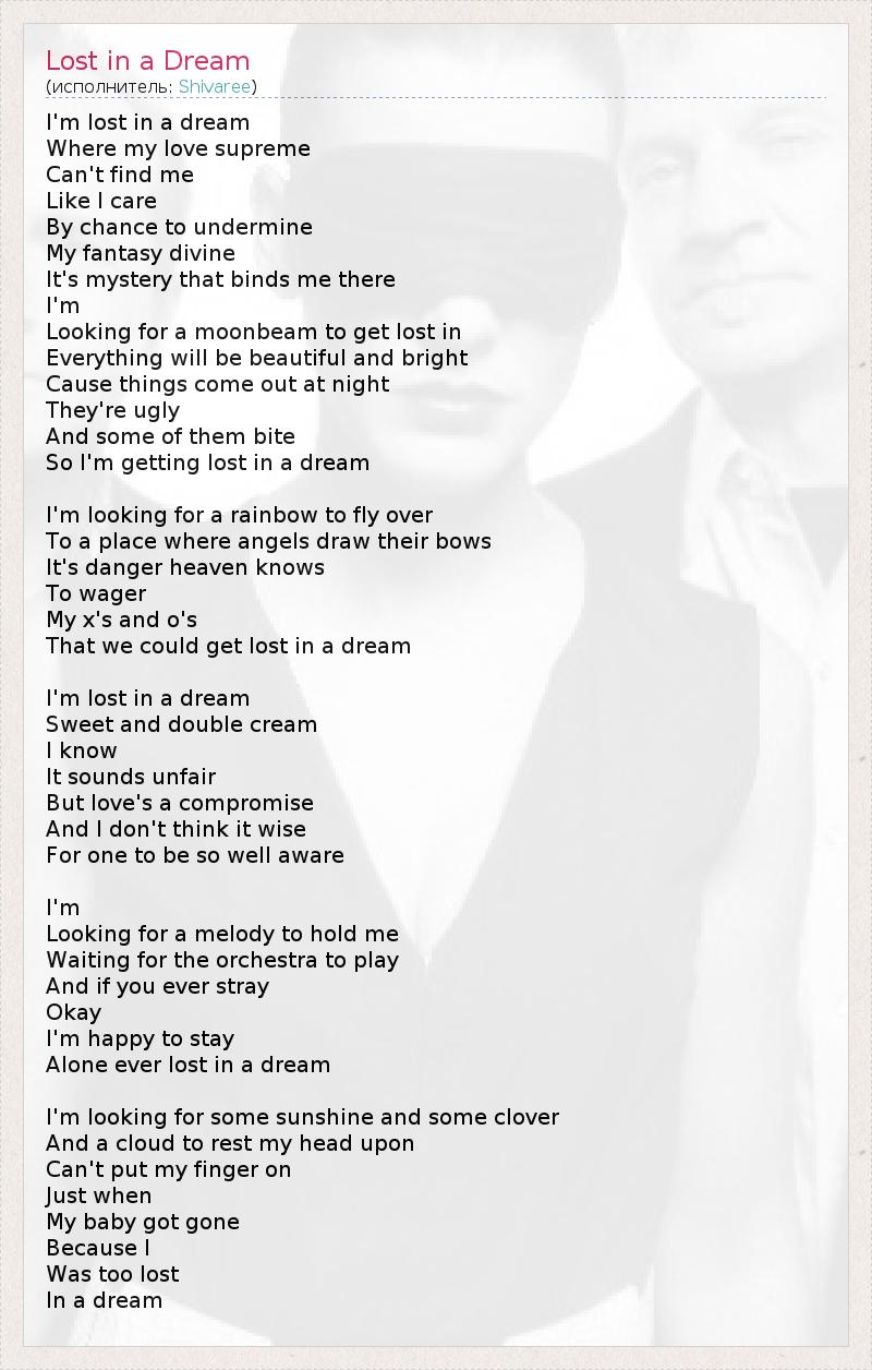 I'm lost in a dream Where my love supreme Can't find me Like I care By chance to undermine My fantasy divine It's mystery that binds me there I'm Looking for a moonbeam to get lost in Everything will be beautiful and bright Cause things come out at night They're ugly And some of them bite So I'm getting lost in a dream I'm looking for a rainbow to fly over To a place where angels draw their bows It's danger heaven knows To wager My x's and o's That we could get lost in a dream I'm lost in a dream Sweet and double cream I know It sounds unfair But love's a compromise And I don't think it wise For one to be so well aware I'm Looking for a melody to hold me Waiting for the orchestra to play And if you ever stray Okay I'm happy to stay Alone ever lost in a dream I'm looking for some sunshine and some clover And a cloud to rest my head upon Can't put my finger on Just when My baby got gone Because I Was too lost In a dream