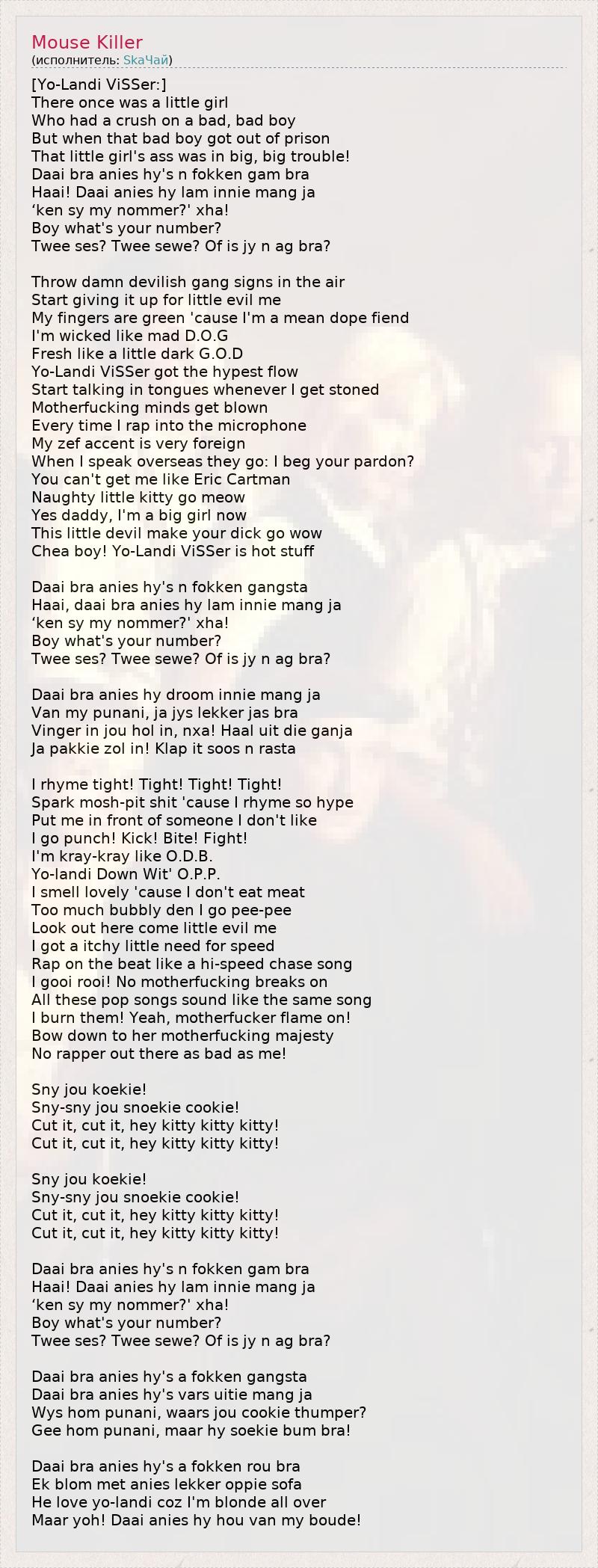 [Yo-Landi ViSSer:] There once was a little girl Who had a crush on a bad, bad boy But when that bad boy got out of prison That little girl's ass was in big, big trouble! Daai bra anies hy's n fokken gam bra Haai! Daai anies hy lam innie mang ja ‘ken sy my nommer?' xha! Boy what's your number? Twee ses? Twee sewe? Of is jy n ag bra? Throw damn devilish gang signs in the air Start giving it up for little evil me My fingers are green 'cause I'm a mean dope fiend I'm wicked like mad D.O.G Fresh like a little dark G.O.D Yo-Landi ViSSer got the hypest flow Start talking in tongues whenever I get stoned Motherfucking minds get blown Every time I rap into the microphone My zef accent is very foreign When I speak overseas they go: I beg your pardon? You can't get me like Eric Cartman Naughty little kitty go meow Yes daddy, I'm a big girl now This little devil make your dick go wow Chea boy! Yo-Landi ViSSer is hot stuff Daai bra anies hy's n fokken gangsta Haai, daai bra anies hy lam innie mang ja ‘ken sy my nommer?' xha! Boy what's your number? Twee ses? Twee sewe? Of is jy n ag bra? Daai bra anies hy droom innie mang ja Van my punani, ja jys lekker jas bra Vinger in jou hol in, nxa! Haal uit die ganja Ja pakkie zol in! Klap it soos n rasta I rhyme tight! Tight! Tight! Tight! Spark mosh-pit shit 'cause I rhyme so hype Put me in front of someone I don't like I go punch! Kick! Bite! Fight! I'm kray-kray like O.D.B. Yo-landi Down Wit' O.P.P. I smell lovely 'cause I don't eat meat Too much bubbly den I go pee-pee Look out here come little evil me I got a itchy little need for speed Rap on the beat like a hi-speed chase song I gooi rooi! No motherfucking breaks on All these pop songs sound like the same song I burn them! Yeah, motherfucker flame on! Bow down to her motherfucking majesty No rapper out there as bad as me! Sny jou koekie! Sny-sny jou snoekie cookie! Cut it, cut it, hey kitty kitty kitty! Cut it, cut it, hey kitty kitty kitty! Sny jou koekie! Sny-sny jou snoekie cookie! Cut it, cut it, hey kitty kitty kitty! Cut it, cut it, hey kitty kitty kitty! Daai bra anies hy's n fokken gam bra Haai! Daai anies hy lam innie mang ja ‘ken sy my nommer?' xha! Boy what's your number? Twee ses? Twee sewe? Of is jy n ag bra? Daai bra anies hy's a fokken gangsta Daai bra anies hy's vars uitie mang ja Wys hom punani, waars jou cookie thumper? Gee hom punani, maar hy soekie bum bra! Daai bra anies hy's a fokken rou bra Ek blom met anies lekker oppie sofa He love yo-landi coz I'm blonde all over Maar yoh! Daai anies hy hou van my boude!
