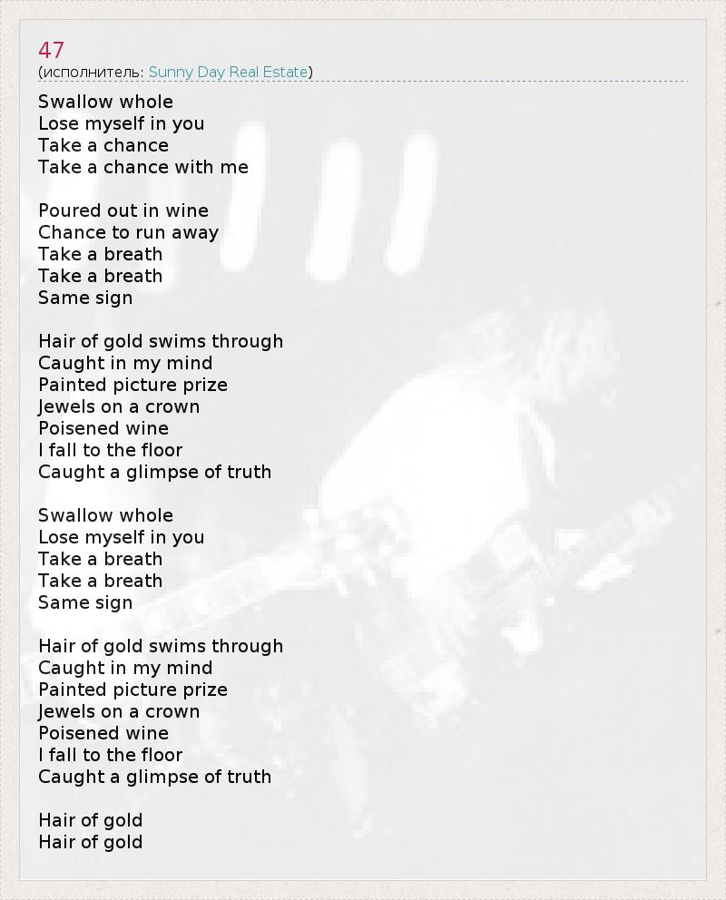 Swallow whole Lose myself in you Take a chance Take a chance with me Poured out in wine Chance to run away Take a breath Take a breath Same sign Hair of gold swims through Caught in my mind Painted picture prize Jewels on a crown Poisened wine I fall to the floor Caught a glimpse of truth Swallow whole Lose myself in you Take a breath Take a breath Same sign Hair of gold swims through Caught in my mind Painted picture prize Jewels on a crown Poisened wine I fall to the floor Caught a glimpse of truth Hair of gold Hair of gold