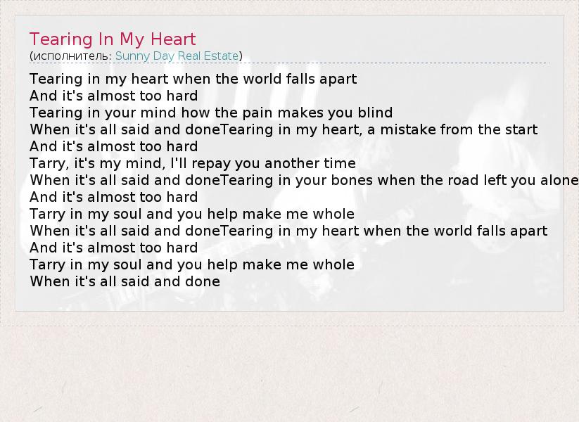 А как ты думаешь, о чем песня "Tearing In My Heart" ?