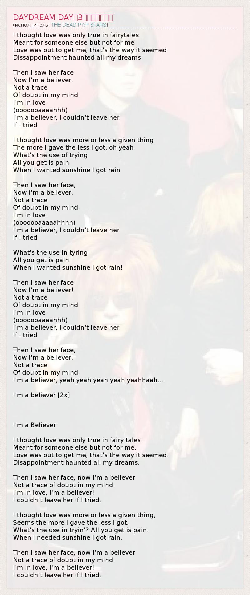I thought love was only true in fairytales Meant for someone else but not for me Love was out to get me, that's the way it seemed Dissappointment haunted all my dreams Then I saw her face Now I'm a believer. Not a trace Of doubt in my mind. I'm in love (ooooooaaaahhh) I'm a believer, I couldn't leave her If I tried I thought love was more or less a given thing The more I gave the less I got, oh yeah What's the use of trying All you get is pain When I wanted sunshine I got rain Then I saw her face, Now i'm a believer. Not a trace Of doubt in my mind. I'm in love (ooooooaaaaahhhh) I'm a believer, I couldn't leave her If I tried What's the use in tyring All you get is pain When I wanted sunshine I got rain! Then I saw her face Now I'm a believer! Not a trace Of doubt in my mind I'm in love (ooooooaaaahhh) I'm a believer, I couldn't leave her If I tried Then I saw her face, Now I'm a believer. Not a trace Of doubt in my mind. I'm a believer, yeah yeah yeah yeah yeahhaah.... I'm a believer [2x] I'm a Believer I thought love was only true in fairy tales Meant for someone else but not for me. Love was out to get me, that's the way it seemed. Disappointment haunted all my dreams. Then I saw her face, now I'm a believer Not a trace of doubt in my mind. I'm in love, I'm a believer! I couldn't leave her if I tried. I thought love was more or less a given thing, Seems the more I gave the less I got. What's the use in tryin'? All you get is pain. When I needed sunshine I got rain. Then I saw her face, now I'm a believer Not a trace of doubt in my mind. I'm in love, I'm a believer! I couldn't leave her if I tried.