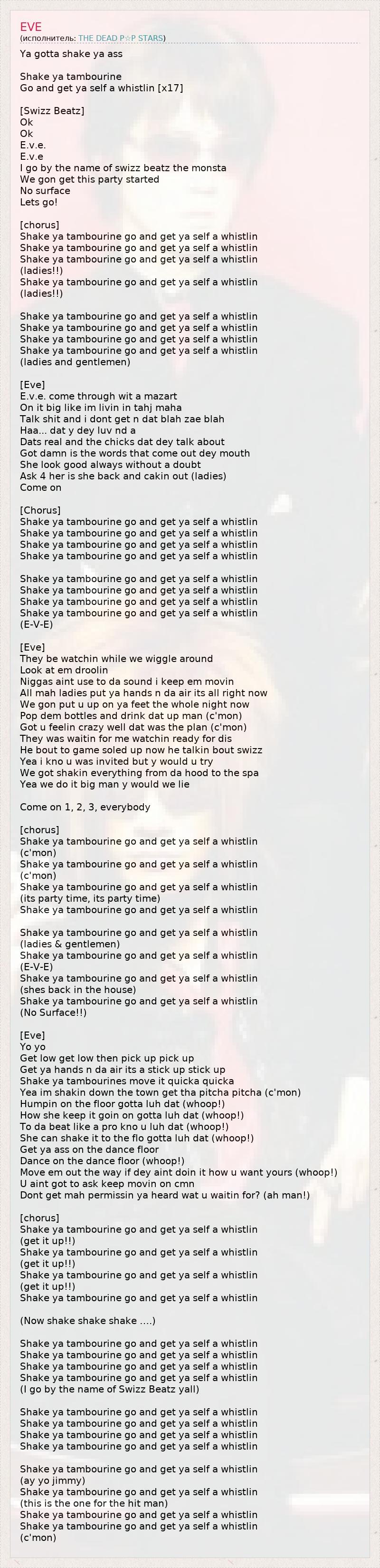 Ya gotta shake ya ass Shake ya tambourine Go and get ya self a whistlin [x17] [Swizz Beatz] Ok Ok E.v.e. E.v.e I go by the name of swizz beatz the monsta We gon get this party started No surface Lets go! [chorus] Shake ya tambourine go and get ya self a whistlin Shake ya tambourine go and get ya self a whistlin Shake ya tambourine go and get ya self a whistlin (ladies!!) Shake ya tambourine go and get ya self a whistlin (ladies!!) Shake ya tambourine go and get ya self a whistlin Shake ya tambourine go and get ya self a whistlin Shake ya tambourine go and get ya self a whistlin Shake ya tambourine go and get ya self a whistlin (ladies and gentlemen) [Eve] E.v.e. come through wit a mazart On it big like im livin in tahj maha Talk shit and i dont get n dat blah zae blah Haa... dat y dey luv nd a Dats real and the chicks dat dey talk about Got damn is the words that come out dey mouth She look good always without a doubt Ask 4 her is she back and cakin out (ladies) Come on [Сhorus] Shake ya tambourine go and get ya self a whistlin Shake ya tambourine go and get ya self a whistlin Shake ya tambourine go and get ya self a whistlin Shake ya tambourine go and get ya self a whistlin Shake ya tambourine go and get ya self a whistlin Shake ya tambourine go and get ya self a whistlin Shake ya tambourine go and get ya self a whistlin Shake ya tambourine go and get ya self a whistlin (E-V-E) [Eve] They be watchin while we wiggle around Look at em droolin Niggas aint use to da sound i keep em movin All mah ladies put ya hands n da air its all right now We gon put u up on ya feet the whole night now Pop dem bottles and drink dat up man (c'mon) Got u feelin crazy well dat was the plan (c'mon) They was waitin for me watchin ready for dis He bout to game soled up now he talkin bout swizz Yea i kno u was invited but y would u try We got shakin everything from da hood to the spa Yea we do it big man y would we lie Come on 1, 2, 3, everybody [chorus] Shake ya tambourine go and get ya self a whistlin (c'mon) Shake ya tambourine go and get ya self a whistlin (c'mon) Shake ya tambourine go and get ya self a whistlin (its party time, its party time) Shake ya tambourine go and get ya self a whistlin Shake ya tambourine go and get ya self a whistlin (ladies & gentlemen) Shake ya tambourine go and get ya self a whistlin (E-V-E) Shake ya tambourine go and get ya self a whistlin (shes back in the house) Shake ya tambourine go and get ya self a whistlin (No Surface!!) [Eve] Yo yo Get low get low then pick up pick up Get ya hands n da air its a stick up stick up Shake ya tambourines move it quicka quicka Yea im shakin down the town get tha pitcha pitcha (c'mon) Humpin on the floor gotta luh dat (whoop!) How she keep it goin on gotta luh dat (whoop!) To da beat like a pro kno u luh dat (whoop!) She can shake it to the flo gotta luh dat (whoop!) Get ya ass on the dance floor Dance on the dance floor (whoop!) Move em out the way if dey aint doin it how u want yours (whoop!) U aint got to ask keep movin on cmn Dont get mah permissin ya heard wat u waitin for? (ah man!) [chorus] Shake ya tambourine go and get ya self a whistlin (get it up!!) Shake ya tambourine go and get ya self a whistlin (get it up!!) Shake ya tambourine go and get ya self a whistlin (get it up!!) Shake ya tambourine go and get ya self a whistlin (Now shake shake shake ….) Shake ya tambourine go and get ya self a whistlin Shake ya tambourine go and get ya self a whistlin Shake ya tambourine go and get ya self a whistlin Shake ya tambourine go and get ya self a whistlin (I go by the name of Swizz Beatz yall) Shake ya tambourine go and get ya self a whistlin Shake ya tambourine go and get ya self a whistlin Shake ya tambourine go and get ya self a whistlin Shake ya tambourine go and get ya self a whistlin Shake ya tambourine go and get ya self a whistlin (ay yo jimmy) Shake ya tambourine go and get ya self a whistlin (this is the one for the hit man) Shake ya tambourine go and get ya self a whistlin Shake ya tambourine go and get ya self a whistlin (c'mon)