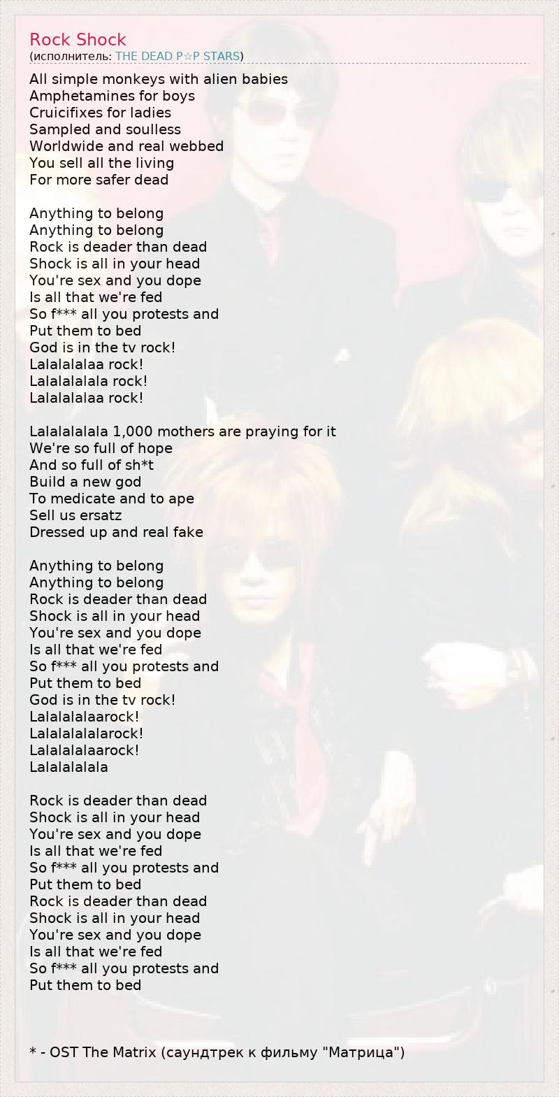 All simple monkeys with alien babies Amphetamines for boys Cruicifixes for ladies Sampled and soulless Worldwide and real webbed You sell all the living For more safer dead Anything to belong Anything to belong Rock is deader than dead Shock is all in your head You're sex and you dope Is all that we're fed So f*** all you protests and Put them to bed God is in the tv rock! Lalalalalaa rock! Lalalalalala rock! Lalalalalaa rock! Lalalalalala 1,000 mothers are praying for it We're so full of hope And so full of sh*t Build a new god To medicate and to ape Sell us ersatz Dressed up and real fake Anything to belong Anything to belong Rock is deader than dead Shock is all in your head You're sex and you dope Is all that we're fed So f*** all you protests and Put them to bed God is in the tv rock! Lalalalalaarock! Lalalalalalarock! Lalalalalaarock! Lalalalalala Rock is deader than dead Shock is all in your head You're sex and you dope Is all that we're fed So f*** all you protests and Put them to bed Rock is deader than dead Shock is all in your head You're sex and you dope Is all that we're fed So f*** all you protests and Put them to bed * - OST The Matrix (саундтрек к фильму "Матрица")