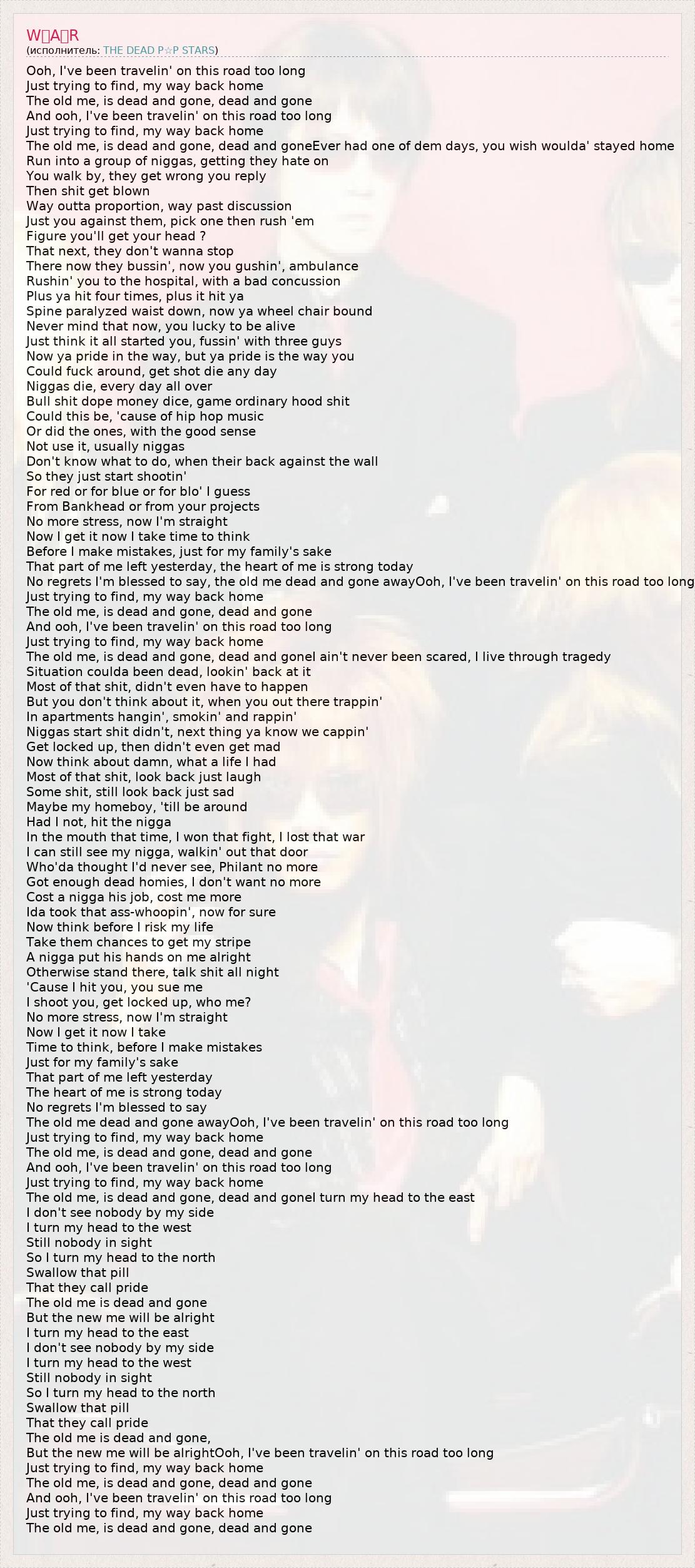 The old me dead and gone awayOoh, I've been travelin' on this road too long