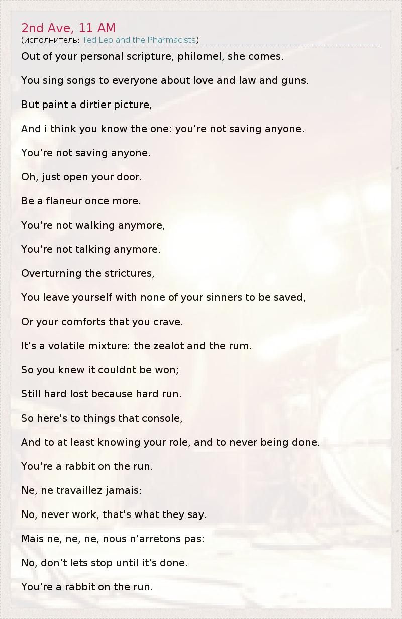 Out of your personal scripture, philomel, she comes. You sing songs to everyone about love and law and guns. But paint a dirtier picture, And i think you know the one: you're not saving anyone. You're not saving anyone. Oh, just open your door. Be a flaneur once more. You're not walking anymore, You're not talking anymore. Overturning the strictures, You leave yourself with none of your sinners to be saved, Or your comforts that you crave. It's a volatile mixture: the zealot and the rum. So you knew it couldnt be won; Still hard lost because hard run. So here's to things that console, And to at least knowing your role, and to never being done. You're a rabbit on the run. Ne, ne travaillez jamais: No, never work, that's what they say. Mais ne, ne, ne, nous n'arretons pas: No, don't lets stop until it's done. You're a rabbit on the run.