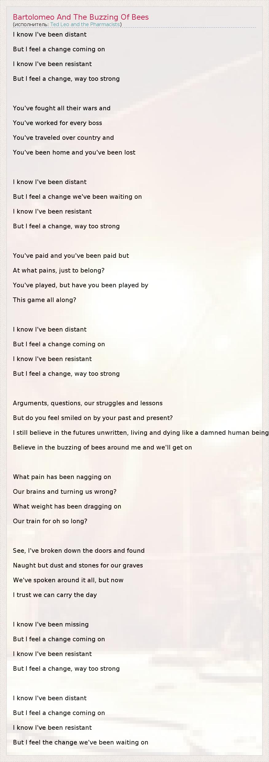 I know I've been distant But I feel a change coming on I know I've been resistant But I feel a change, way too strong You've fought all their wars and You've worked for every boss You've traveled over country and You've been home and you've been lost I know I've been distant But I feel a change we've been waiting on I know I've been resistant But I feel a change, way too strong You've paid and you've been paid but At what pains, just to belong? You've played, but have you been played by This game all along? I know I've been distant But I feel a change coming on I know I've been resistant But I feel a change, way too strong Arguments, questions, our struggles and lessons But do you feel smiled on by your past and present? I still believe in the futures unwritten, living and dying like a damned human being Believe in the buzzing of bees around me and we'll get on What pain has been nagging on Our brains and turning us wrong? What weight has been dragging on Our train for oh so long? See, I've broken down the doors and found Naught but dust and stones for our graves We've spoken around it all, but now I trust we can carry the day I know I've been missing But I feel a change coming on I know I've been resistant But I feel a change, way too strong I know I've been distant But I feel a change coming on I know I've been resistant But I feel the change we've been waiting on