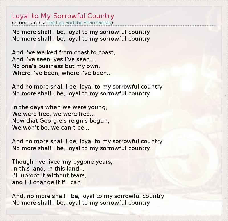 No more shall I be, loyal to my sorrowful country No more shall I be, loyal to my sorrowful country And I've walked from coast to coast, And I've seen, yes I've seen... No one's business but my own, Where I've been, where I've been... And no more shall I be, loyal to my sorrowful country No more shall I be, loyal to my sorrowful country In the days when we were young, We were free, we were free... Now that Georgie's reign's begun, We won't be, we can't be... And no more shall I be, loyal to my sorrowful country No more shall I be, loyal to my sorrowful country. Though I've lived my bygone years, In this land, in this land... I'll uproot it without tears, and I'll change it if I can! And, no more shall I be, loyal to my sorrowful country No more shall I be, loyal to my sorrowful country
