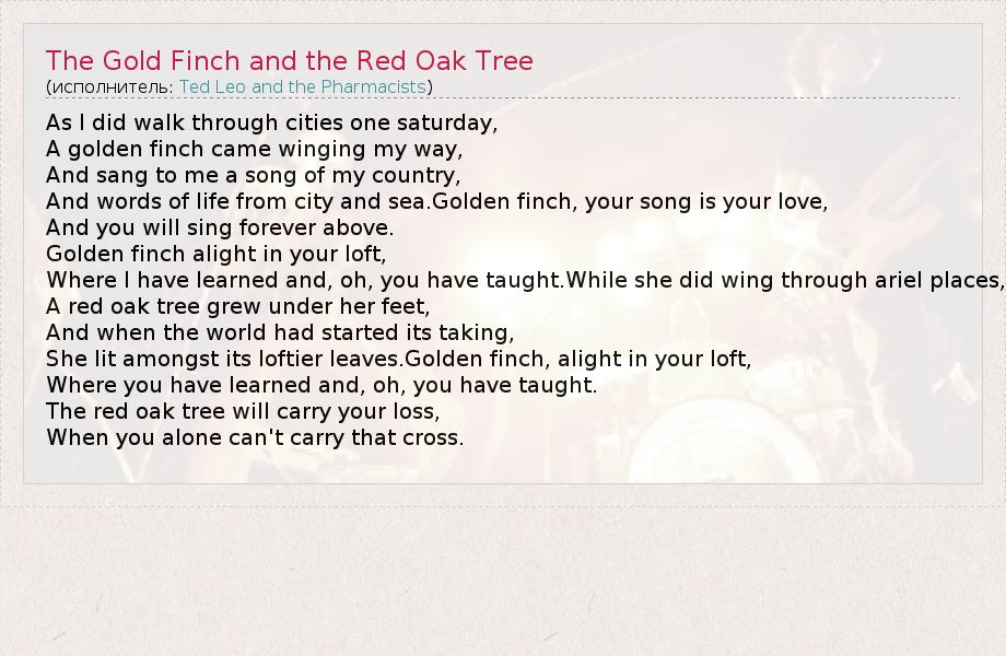 А как ты думаешь, о чем песня "The Gold Finch and the Red Oak Tree" ?