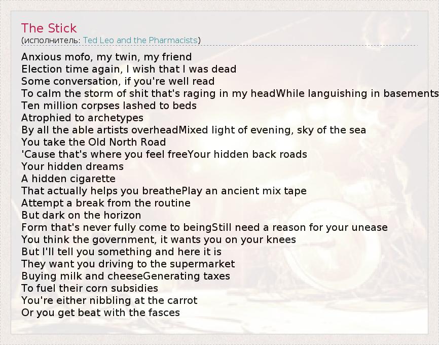 Это интересно:Ted Leo and the Pharmacists (иногда пишется Ted Leo / Pharmacists, Ted Leo + Pharmacists, или TL / Rx) - американская рок-группа образована в 1999 году в Вашингтоне, округ Колумбия. Они выпустили шесть студийных альбомов и гастролировали на международном уровне. Хотя состав группы менялся в течение своей карьеры, певец / гитарист Тед Лео остается основным автором песен группы, творческие силой и единственным постоянным участником.... продолжение