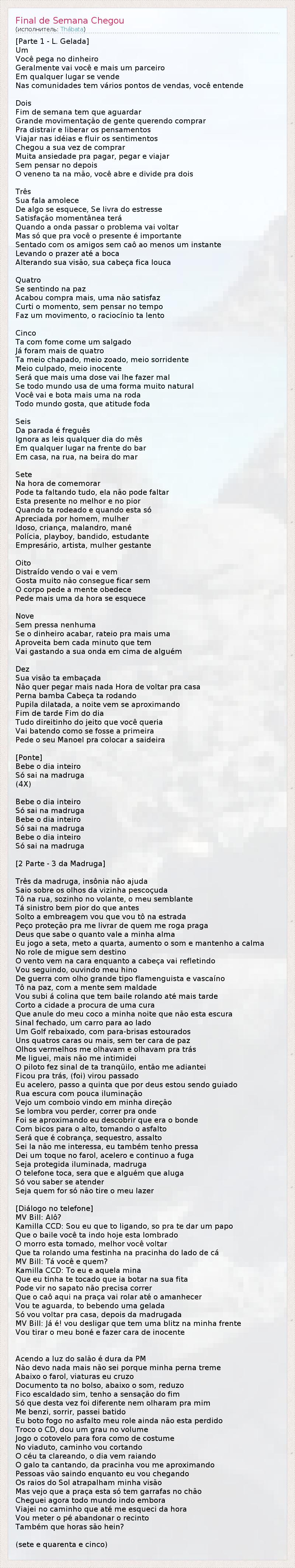 [Parte 1 - L. Gelada] Um Você pega no dinheiro Geralmente vai você e mais um parceiro Em qualquer lugar se vende Nas comunidades tem vários pontos de vendas, você entende Dois Fim de semana tem que aguardar Grande movimentação de gente querendo comprar Pra distrair e liberar os pensamentos Viajar nas idéias e fluir os sentimentos Chegou a sua vez de comprar Muita ansiedade pra pagar, pegar e viajar Sem pensar no depois O veneno ta na mão, você abre e divide pra dois Três Sua fala amolece De algo se esquece, Se livra do estresse Satisfação momentânea terá Quando a onda passar o problema vai voltar Mas só que pra você o presente é importante Sentado com os amigos sem caô ao menos um instante Levando o prazer até a boca Alterando sua visão, sua cabeça fica louca Quatro Se sentindo na paz Acabou compra mais, uma não satisfaz Curti o momento, sem pensar no tempo Faz um movimento, o raciocínio ta lento Cinco Ta com fome come um salgado Já foram mais de quatro Ta meio chapado, meio zoado, meio sorridente Meio culpado, meio inocente Será que mais uma dose vai lhe fazer mal Se todo mundo usa de uma forma muito natural Você vai e bota mais uma na roda Todo mundo gosta, que atitude foda Seis Da parada é freguês Ignora as leis qualquer dia do mês Em qualquer lugar na frente do bar Em casa, na rua, na beira do mar Sete Na hora de comemorar Pode ta faltando tudo, ela não pode faltar Esta presente no melhor e no pior Quando ta rodeado e quando esta só Apreciada por homem, mulher Idoso, criança, malandro, mané Polícia, playboy, bandido, estudante Empresário, artista, mulher gestante Oito Distraído vendo o vai e vem Gosta muito não consegue ficar sem O corpo pede a mente obedece Pede mais uma da hora se esquece Nove Sem pressa nenhuma Se o dinheiro acabar, rateio pra mais uma Aproveita bem cada minuto que tem Vai gastando a sua onda em cima de alguém Dez Sua visão ta embaçada Não quer pegar mais nada Hora de voltar pra casa Perna bamba Cabeça ta rodando Pupila dilatada, a noite vem se aproximando Fim de tarde Fim do dia Tudo direitinho do jeito que você queria Vai batendo como se fosse a primeira Pede o seu Manoel pra colocar a saideira [Ponte] Bebe o dia inteiro Só sai na madruga (4X) Bebe o dia inteiro Só sai na madruga Bebe o dia inteiro Só sai na madruga Bebe o dia inteiro Só sai na madruga [2 Parte - 3 da Madruga] Três da madruga, insônia não ajuda Saio sobre os olhos da vizinha pescoçuda Tô na rua, sozinho no volante, o meu semblante Tá sinistro bem pior do que antes Solto a embreagem vou que vou tô na estrada Peço proteção pra me livrar de quem me roga praga Deus que sabe o quanto vale a minha alma Eu jogo a seta, meto a quarta, aumento o som e mantenho a calma No role de migue sem destino O vento vem na cara enquanto a cabeça vai refletindo Vou seguindo, ouvindo meu hino De guerra com olho grande tipo flamenguista e vascaíno Tô na paz, com a mente sem maldade Vou subi á colina que tem baile rolando até mais tarde Corto a cidade a procura de uma cura Que anule do meu coco a minha noite que não esta escura Sinal fechado, um carro para ao lado Um Golf rebaixado, com para-brisas estourados Uns quatros caras ou mais, sem ter cara de paz Olhos vermelhos me olhavam e olhavam pra trás Me liguei, mais não me intimidei O piloto fez sinal de ta tranqüilo, então me adiantei Ficou pra trás, (foi) virou passado Eu acelero, passo a quinta que por deus estou sendo guiado Rua escura com pouca iluminação Vejo um comboio vindo em minha direção Se lombra vou perder, correr pra onde Foi se aproximando eu descobrir que era o bonde Com bicos para o alto, tomando o asfalto Será que é cobrança, sequestro, assalto Sei la não me interessa, eu também tenho pressa Dei um toque no farol, acelero e continuo a fuga Seja protegida iluminada, madruga O telefone toca, sera que e alguém que aluga Só vou saber se atender Seja quem for só não tire o meu lazer [Diálogo no telefone] MV Bill: Alô? Kamilla CCD: Sou eu que to ligando, so pra te dar um papo Que o baile você ta indo hoje esta lombrado O morro esta tomado, melhor você voltar Que ta rolando uma festinha na pracinha do lado de cá MV Bill: Tá você e quem? Kamilla CCD: To eu e aquela mina Que eu tinha te tocado que ia botar na sua fita Pode vir no sapato não precisa correr Que o caô aqui na praça vai rolar até o amanhecer Vou te aguarda, to bebendo uma gelada Só vou voltar pra casa, depois da madrugada MV Bill: Já é! vou desligar que tem uma blitz na minha frente Vou tirar o meu boné e fazer cara de inocente Acendo a luz do salão é dura da PM Não devo nada mais não sei porque minha perna treme Abaixo o farol, viaturas eu cruzo Documento ta no bolso, abaixo o som, reduzo Fico escaldado sim, tenho a sensação do fim Só que desta vez foi diferente nem olharam pra mim Me benzi, sorrir, passei batido Eu boto fogo no asfalto meu role ainda não esta perdido Troco o CD, dou um grau no volume Jogo o cotovelo para fora como de costume No viaduto, caminho vou cortando O céu ta clareando, o dia vem raiando O galo ta cantando, da pracinha vou me aproximando Pessoas vão saindo enquanto eu vou chegando Os raios do Sol atrapalham minha visão Mas vejo que a praça esta só tem garrafas no chão Cheguei agora todo mundo indo embora Viajei no caminho que até me esqueci da hora Vou meter o pé abandonar o recinto Também que horas são hein? (sete e quarenta e cinco)