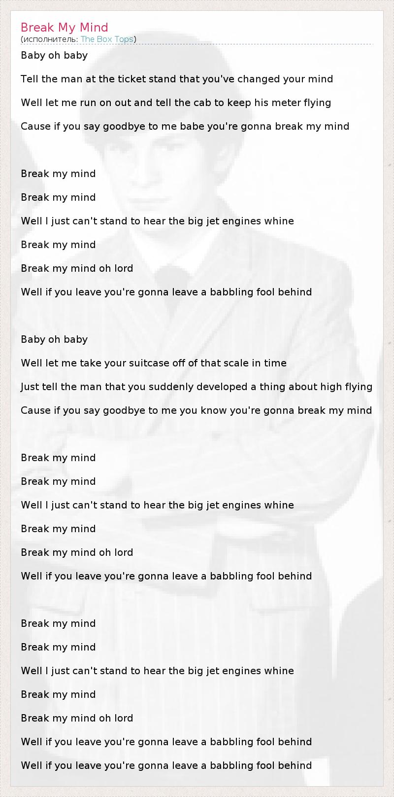 Baby oh baby Tell the man at the ticket stand that you've changed your mind Well let me run on out and tell the cab to keep his meter flying Cause if you say goodbye to me babe you're gonna break my mind Break my mind Break my mind Well I just can't stand to hear the big jet engines whine Break my mind Break my mind oh lord Well if you leave you're gonna leave a babbling fool behind Baby oh baby Well let me take your suitcase off of that scale in time Just tell the man that you suddenly developed a thing about high flying Cause if you say goodbye to me you know you're gonna break my mind Break my mind Break my mind Well I just can't stand to hear the big jet engines whine Break my mind Break my mind oh lord Well if you leave you're gonna leave a babbling fool behind Break my mind Break my mind Well I just can't stand to hear the big jet engines whine Break my mind Break my mind oh lord Well if you leave you're gonna leave a babbling fool behind Well if you leave you're gonna leave a babbling fool behind