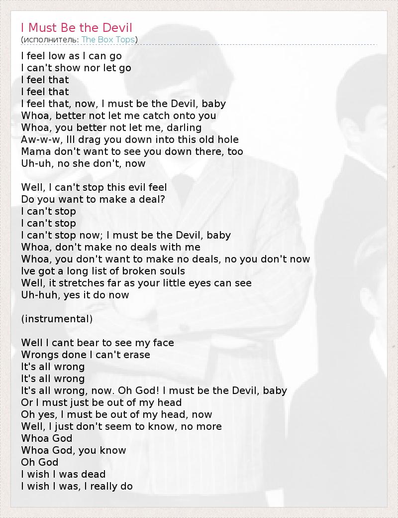 I feel low as I can go I can't show nor let go I feel that I feel that I feel that, now, I must be the Devil, baby Whoa, better not let me catch onto you Whoa, you better not let me, darling Aw-w-w, Ill drag you down into this old hole Mama don't want to see you down there, too Uh-uh, no she don't, now Well, I can't stop this evil feel Do you want to make a deal? I can't stop I can't stop I can't stop now; I must be the Devil, baby Whoa, don't make no deals with me Whoa, you don't want to make no deals, no you don't now Ive got a long list of broken souls Well, it stretches far as your little eyes can see Uh-huh, yes it do now (instrumental) Well I cant bear to see my face Wrongs done I can't erase It's all wrong It's all wrong It's all wrong, now. Oh God! I must be the Devil, baby Or I must just be out of my head Oh yes, I must be out of my head, now Well, I just don't seem to know, no more Whoa God Whoa God, you know Oh God I wish I was dead I wish I was, I really do