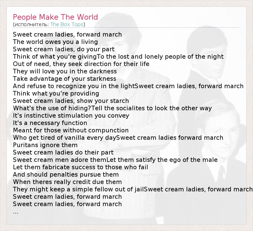 Sweet cream ladies, forward march The world owes you a living Sweet cream ladies, do your part Think of what you're givingTo the lost and lonely people of the night Out of need, they seek direction for their life They will love you in the darkness Take advantage of your starkness And refuse to recognize you in the lightSweet cream ladies, forward march Think what you're providing Sweet cream ladies, show your starch What's the use of hiding?Tell the socialites to look the other way It's instinctive stimulation you convey It's a necessary function Meant for those without compunction Who get tired of vanilla every daySweet cream ladies forward march Puritans ignore them Sweet cream ladies do their part Sweet cream men adore themLet them satisfy the ego of the male Let them fabricate success to those who fail And should penalties pursue them When theres really credit due them They might keep a simple fellow out of jailSweet cream ladies, forward march Sweet cream ladies, forward march Sweet cream ladies, forward march ...
