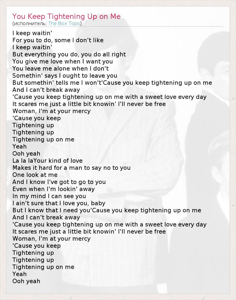 I keep waitin' For you to do, some I don't like I keep waitin' But everything you do, you do all right You give me love when I want you You leave me alone when I don't Somethin' says I ought to leave you But somethin' tells me I won't'Cause you keep tightening up on me And I can't break away 'Cause you keep tightening up on me with a sweet love every day It scares me just a little bit knowin' I'll never be free Woman, I'm at your mercy 'Cause you keep Tightening up Tightening up Tightening up on me Yeah Ooh yeah La la laYour kind of love Makes it hard for a man to say no to you One look at me And I know I've got to go to you Even when I'm lookin' away In my mind I can see you I ain't sure that I love you, baby But I know that I need you'Cause you keep tightening up on me And I can't break away 'Cause you keep tightening up on me with a sweet love every day It scares me just a little bit knowin' I'll never be free Woman, I'm at your mercy 'Cause you keep Tightening up Tightening up Tightening up on me Yeah Ooh yeah