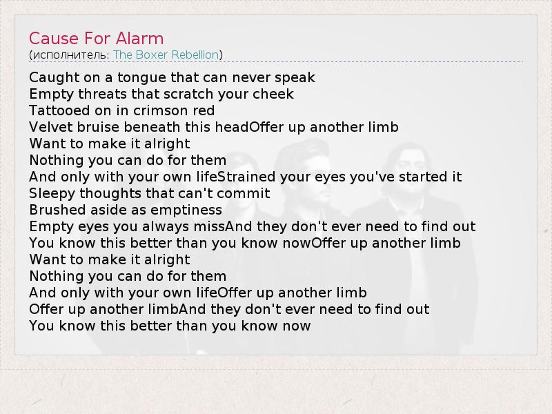 А как ты думаешь, о чем песня "Cause For Alarm" ?