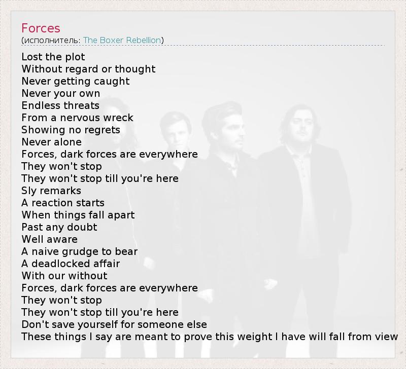 Lost the plot Without regard or thought Never getting caught Never your own Endless threats From a nervous wreck Showing no regrets Never alone Forces, dark forces are everywhere They won't stop They won't stop till you're here Sly remarks A reaction starts When things fall apart Past any doubt Well aware A naive grudge to bear A deadlocked affair With our without Forces, dark forces are everywhere They won't stop They won't stop till you're here Don't save yourself for someone else These things I say are meant to prove this weight I have will fall from view