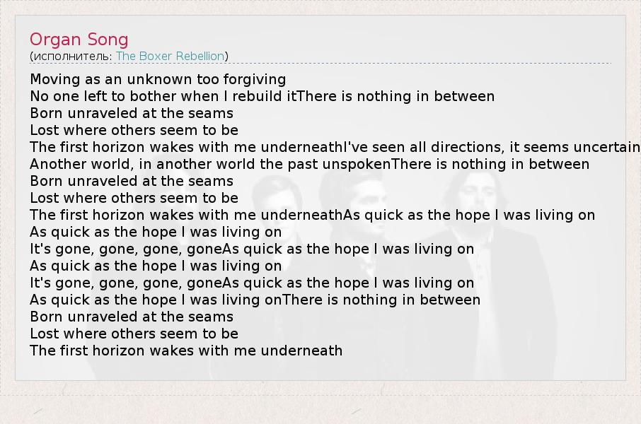 Это интересно:The Boxer Rebellion – международный рок-проект, в состав которого входят 4 участника из разных стран мира - Натан Николсон (Nathan Nicholson) (Vocals/Guitar/Keys) из США, Тодд Хоу (Todd Howe) (Lead Guitar) из Австралии и двое англичан - Адам Харрисон (Adam Harrison) (Bass Guitar) и Пьерс Хьюит (Piers Hewitt) (Drums). Группа впервые собралась в 2001 году. На их счету... продолжение