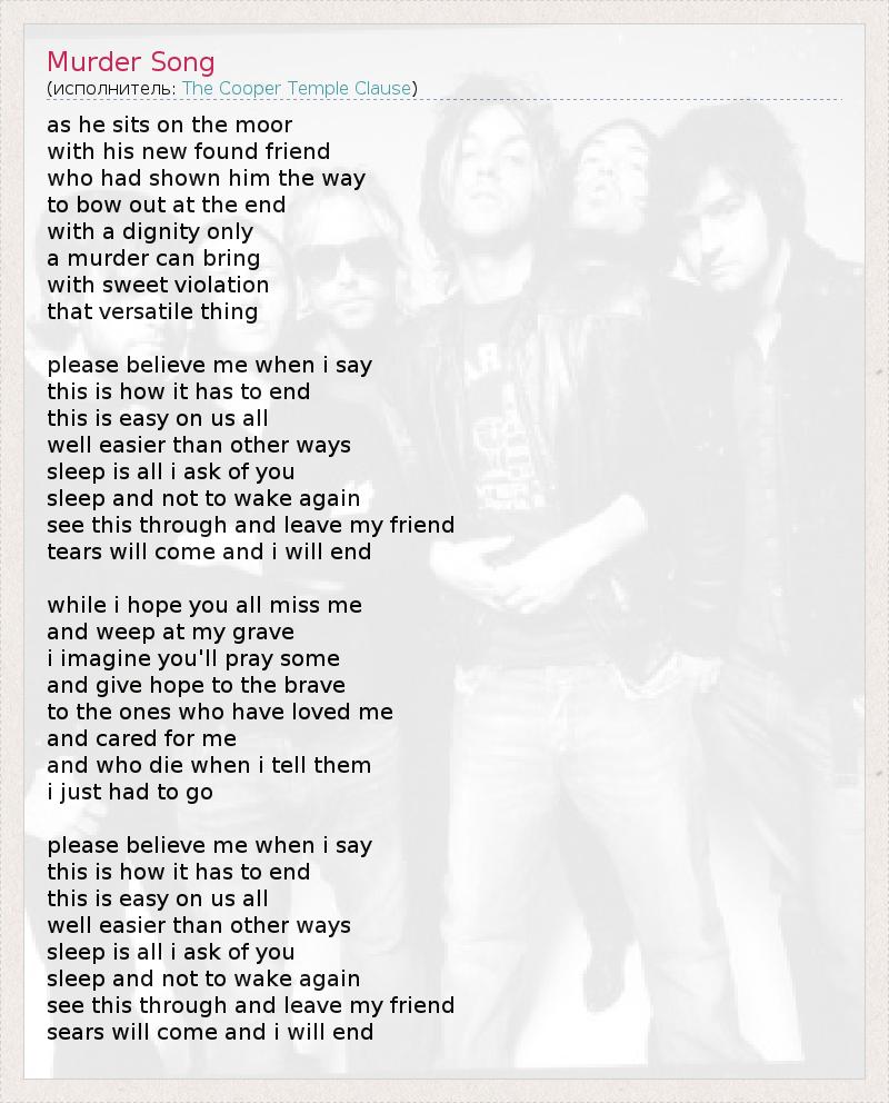 as he sits on the moor with his new found friend who had shown him the way to bow out at the end with a dignity only a murder can bring with sweet violation that versatile thing please believe me when i say this is how it has to end this is easy on us all well easier than other ways sleep is all i ask of you sleep and not to wake again see this through and leave my friend tears will come and i will end while i hope you all miss me and weep at my grave i imagine you'll pray some and give hope to the brave to the ones who have loved me and cared for me and who die when i tell them i just had to go please believe me when i say this is how it has to end this is easy on us all well easier than other ways sleep is all i ask of you sleep and not to wake again see this through and leave my friend sears will come and i will end