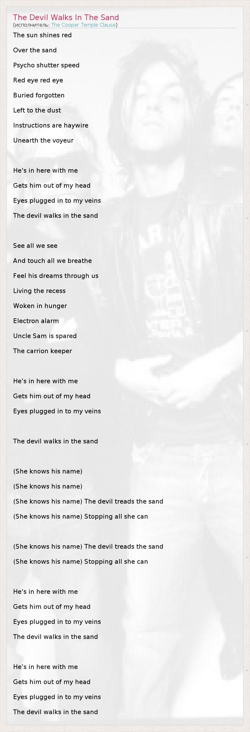 The sun shines red Over the sand Psycho shutter speed Red eye red eye Buried forgotten Left to the dust Instructions are haywire Unearth the voyeur He's in here with me Gets him out of my head Eyes plugged in to my veins The devil walks in the sand See all we see And touch all we breathe Feel his dreams through us Living the recess Woken in hunger Electron alarm Uncle Sam is spared The carrion keeper He's in here with me Gets him out of my head Eyes plugged in to my veins The devil walks in the sand (She knows his name) (She knows his name) (She knows his name) The devil treads the sand (She knows his name) Stopping all she can (She knows his name) The devil treads the sand (She knows his name) Stopping all she can He's in here with me Gets him out of my head Eyes plugged in to my veins The devil walks in the sand He's in here with me Gets him out of my head Eyes plugged in to my veins The devil walks in the sand