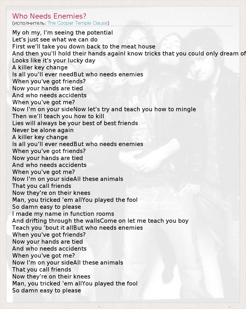 А как ты думаешь, о чем песня "Who Needs Enemies?" ?